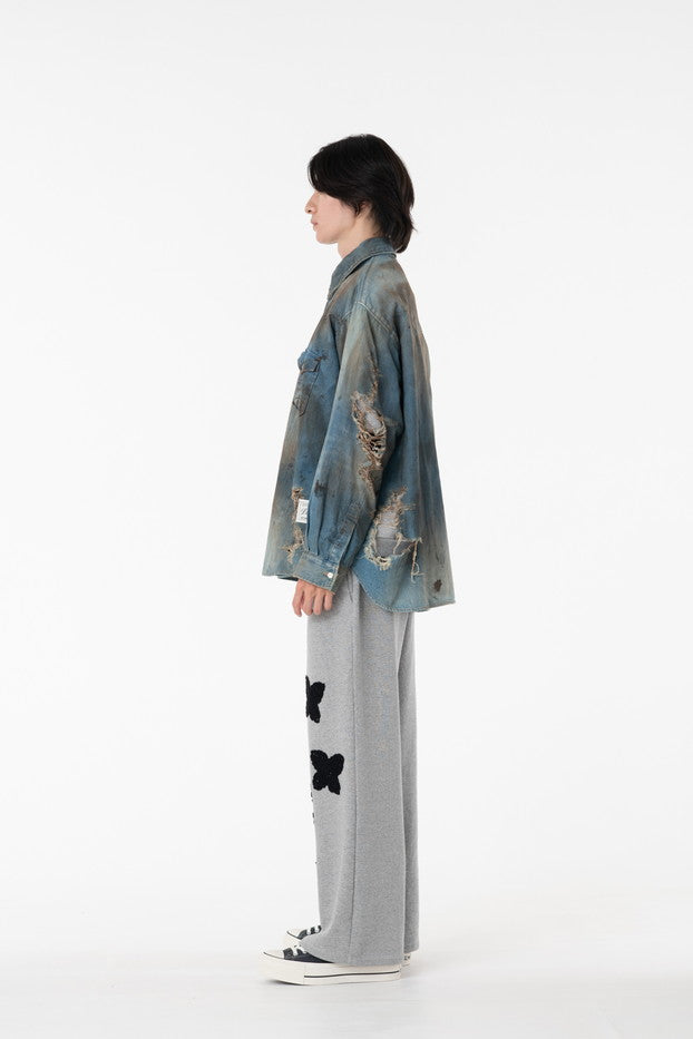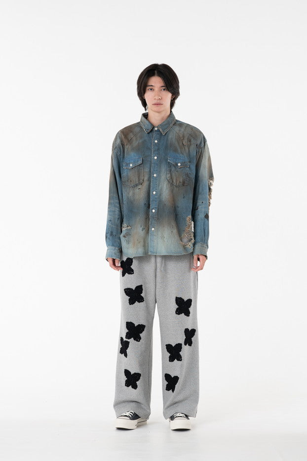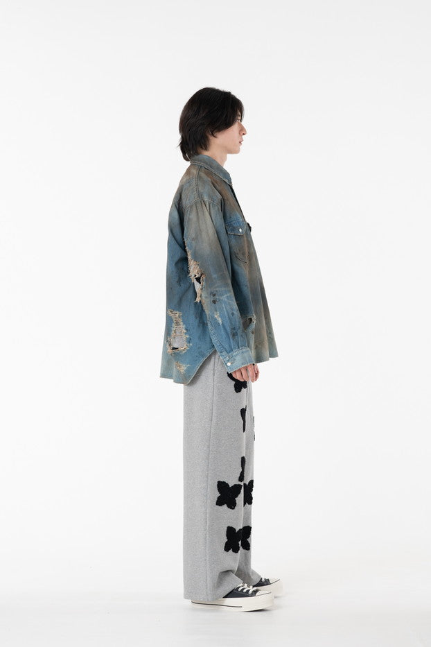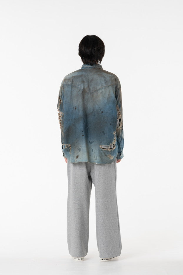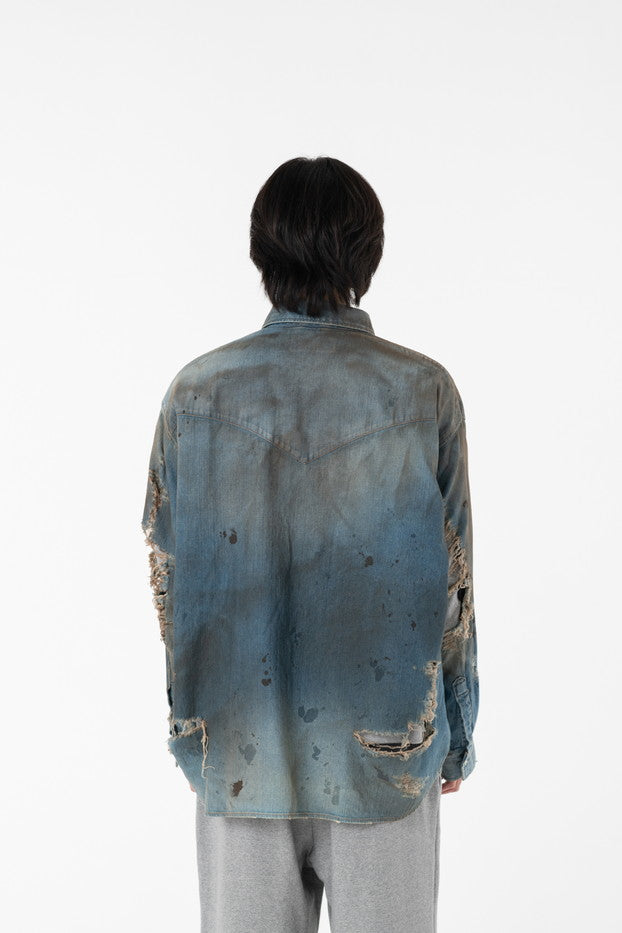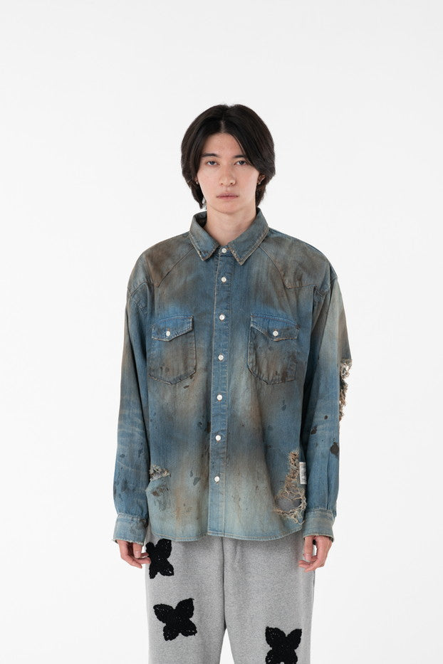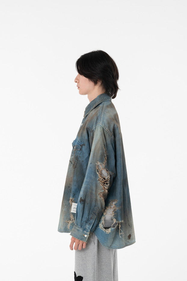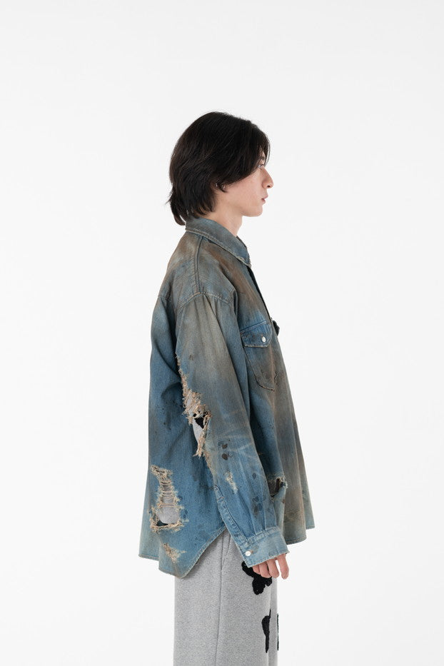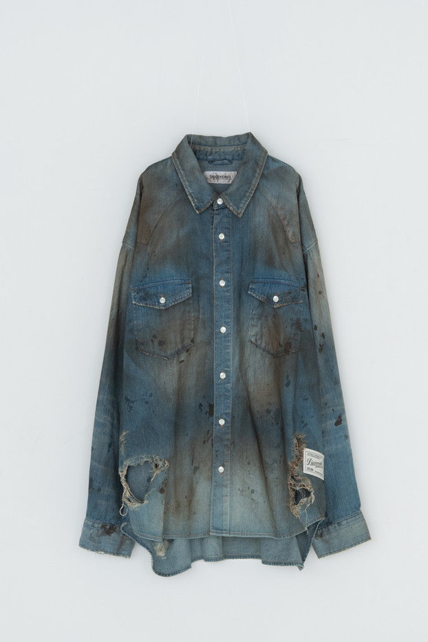 9ozの縦⽷✖ムラ⽷の凹凸感が出やすい素材を使⽤ したデニムシャツ。加⼯には擦り,⽳あけ,オーバーダイ、油汚れなど計算されたヴィンテージ加工、 シルエットはややワイドシルエットと今の気分にピッタリのコーディネートに取り⼊れやすいアイテム。