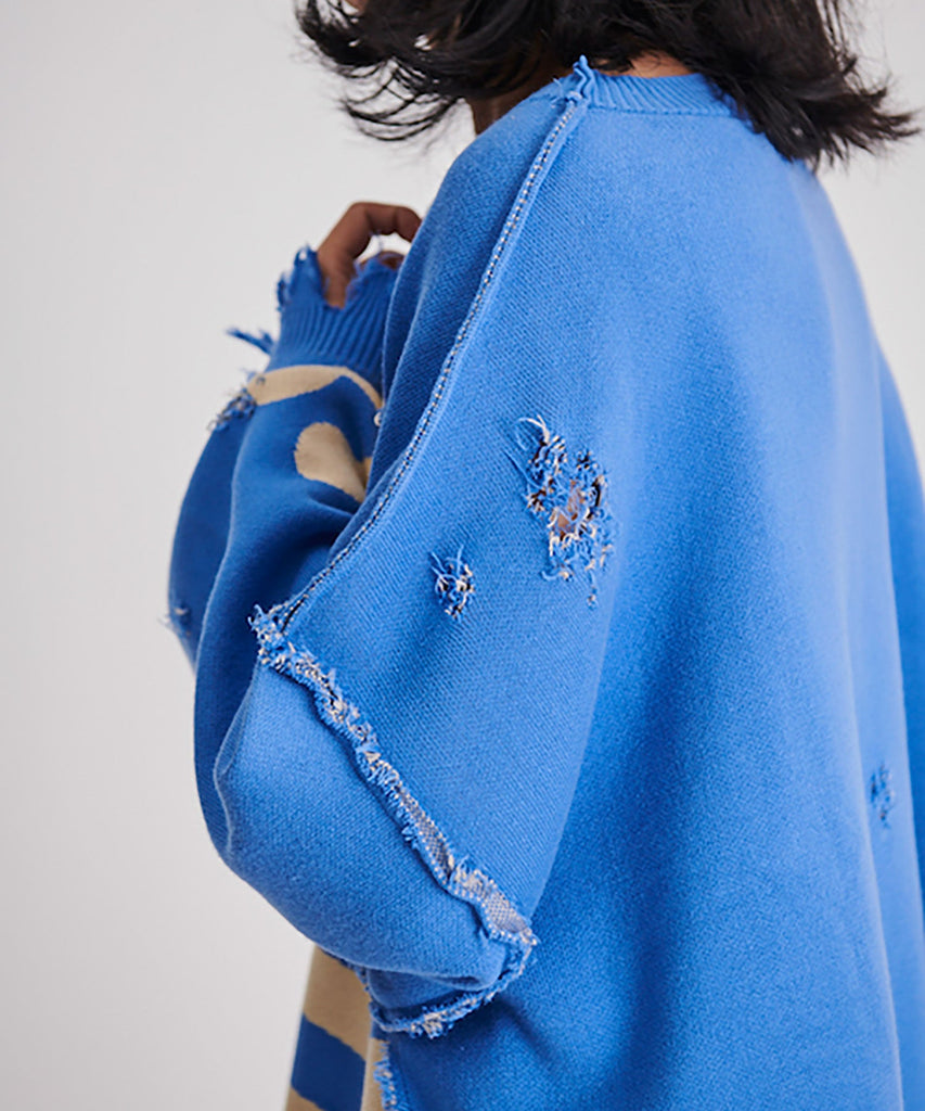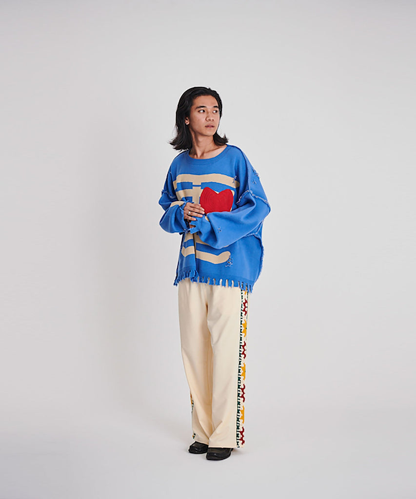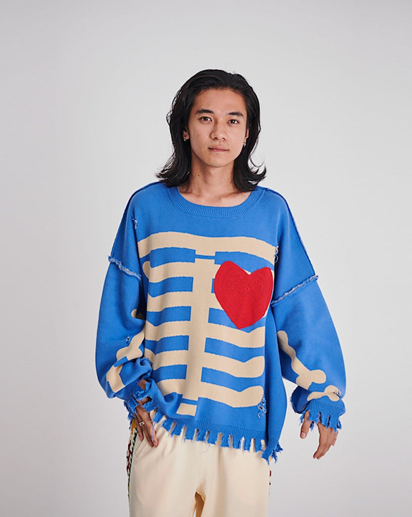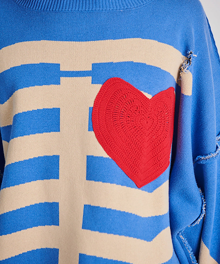 膨らみのあるコットン100%の⽷を使⽤した 12Gダブルジャガードニット。⾝幅が広めで 着丈短め、スカルジャガード、ハートクロシ ェット、ダメージ加⼯と楽しさ溢れるアイテ ム。