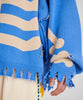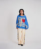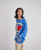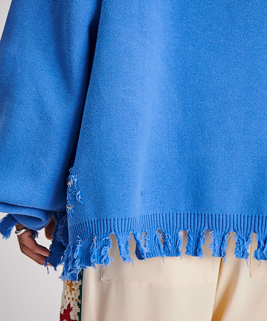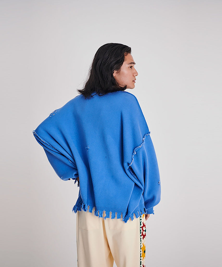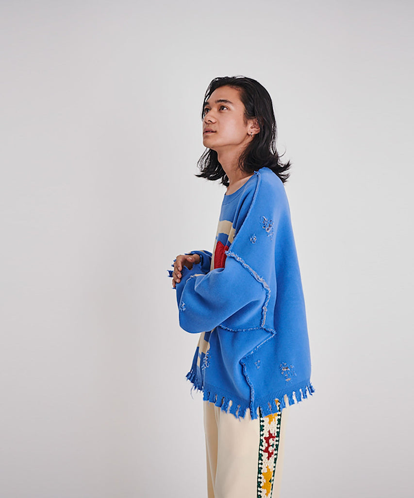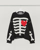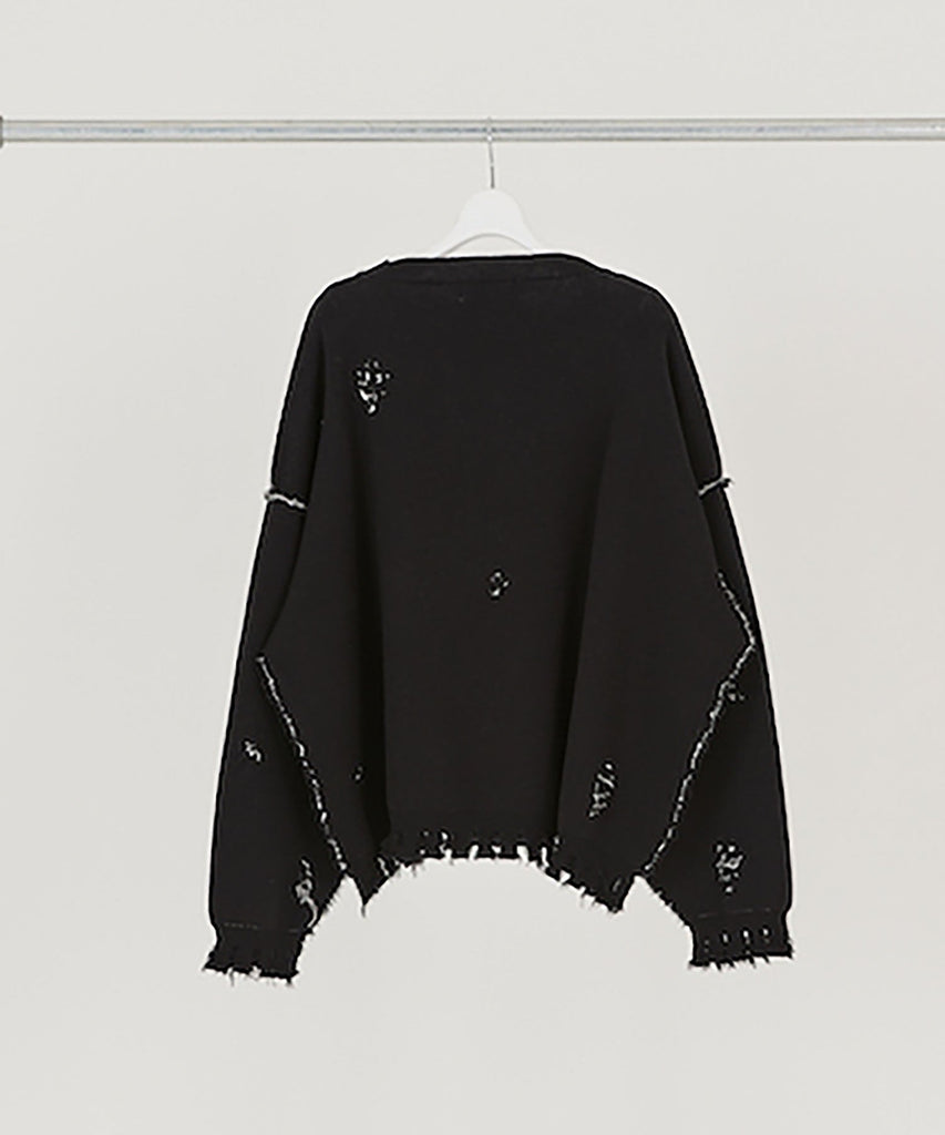 膨らみのあるコットン100%の⽷を使⽤した 12Gダブルジャガードニット。⾝幅が広めで 着丈短め、スカルジャガード、ハートクロシ ェット、ダメージ加⼯と楽しさ溢れるアイテ ム。