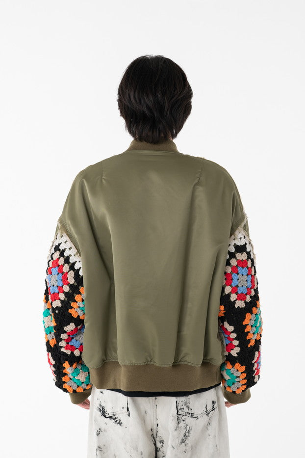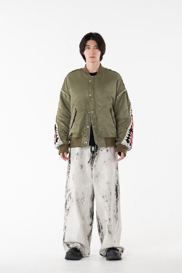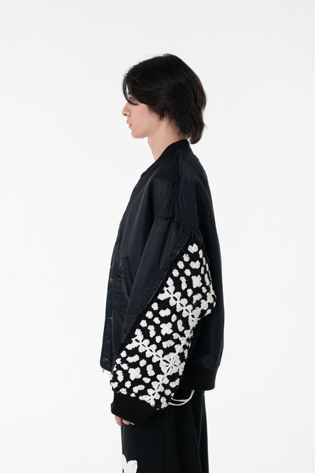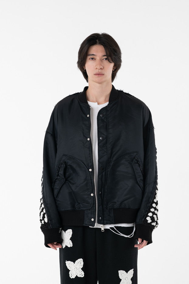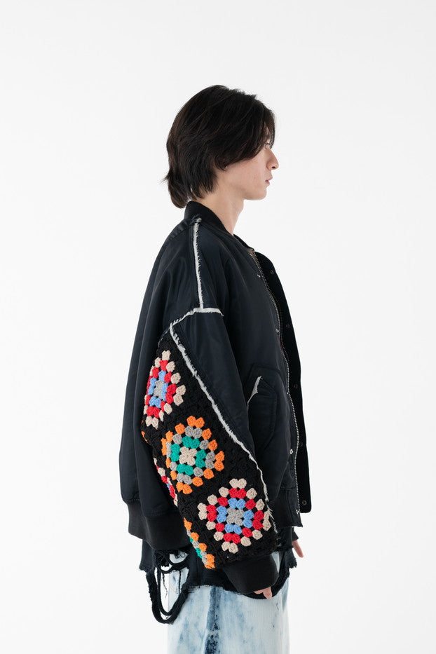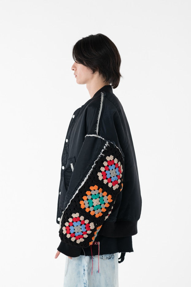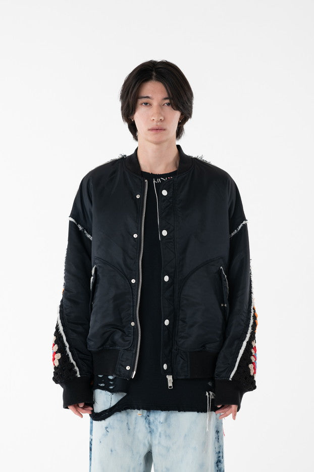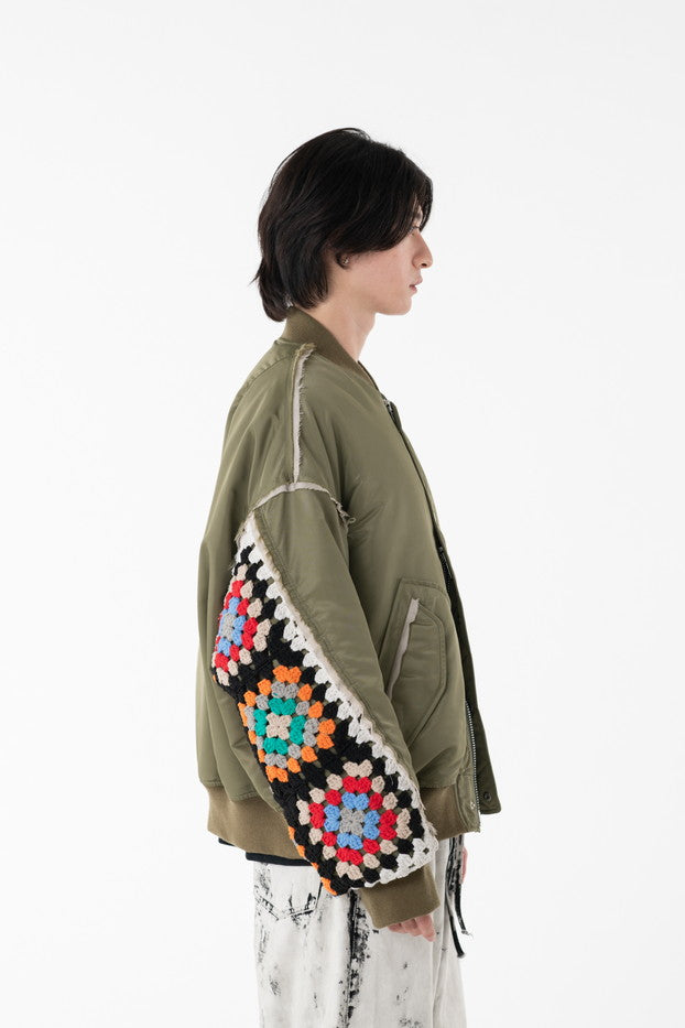 イタリアのリモンタ社の撥水加工されたナイロンを使用したリラックスしたシルエットのMA-1ブルゾン。インサイドアウトのデザインと袖の手編みによるかぎ針編みのニット切り替えデザインがポイントとなったアイテム。サイズ1[cm]:着丈68 肩幅69 身幅78.5 袖丈58サイズ3[cm]:着丈71 肩幅71 身幅81 袖丈61素材:NYLON100% [裏地]POLYESTER100%モデル(185m/64kg)着用サイズ:3