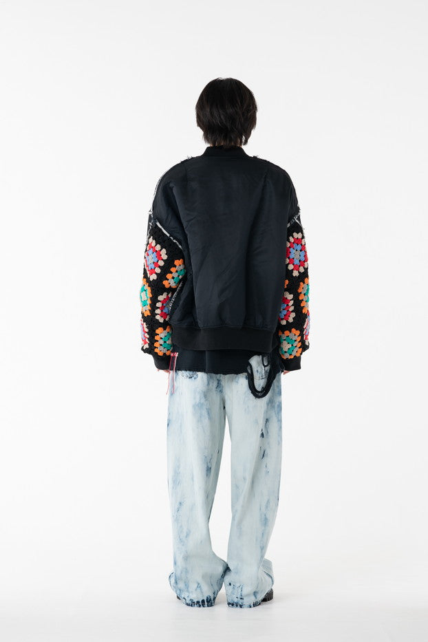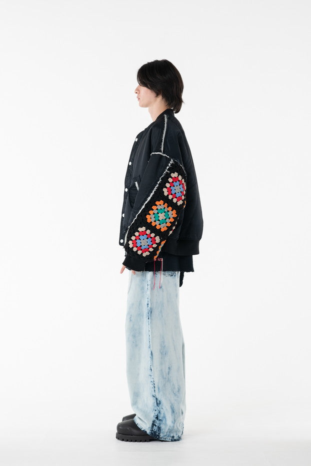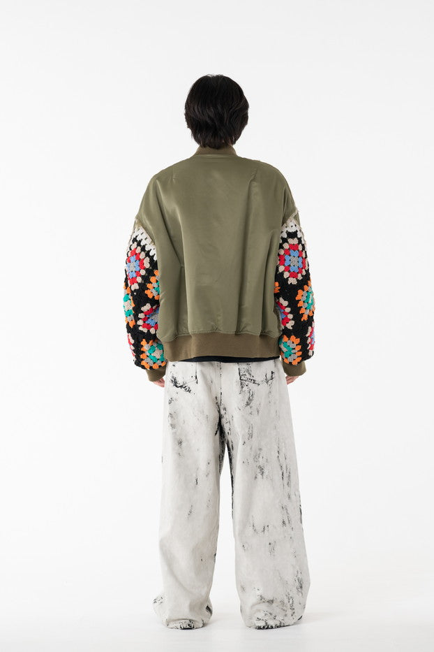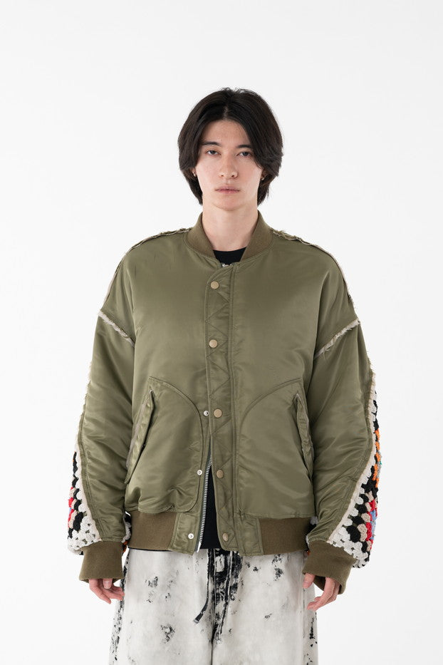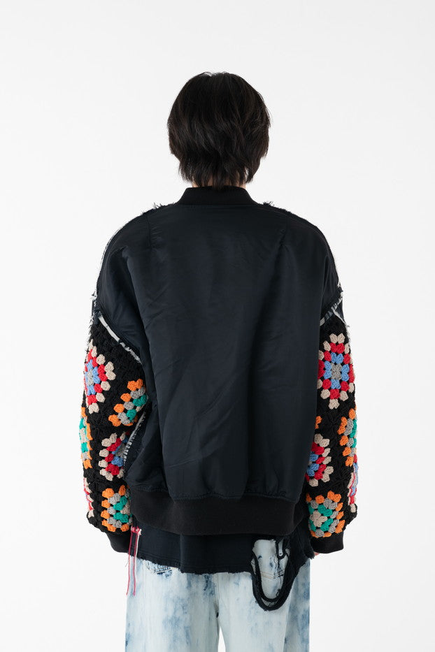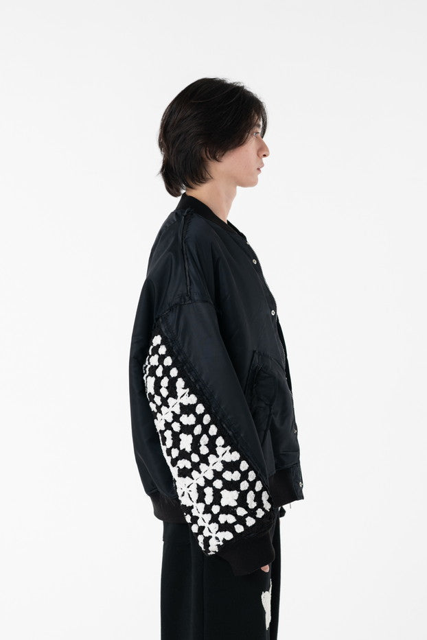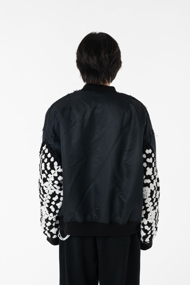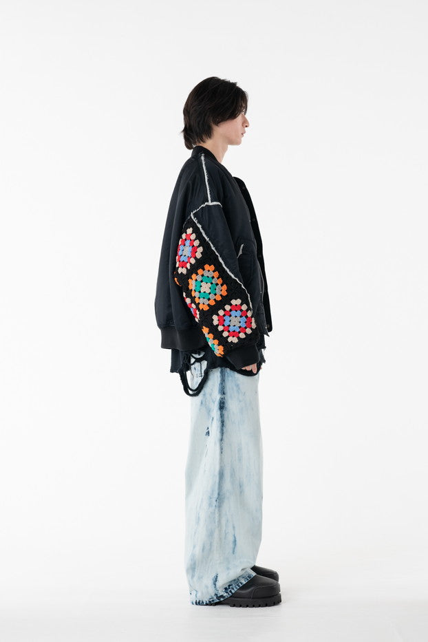 イタリアのリモンタ社の撥水加工されたナイロンを使用したリラックスしたシルエットのMA-1ブルゾン。インサイドアウトのデザインと袖の手編みによるかぎ針編みのニット切り替えデザインがポイントとなったアイテム。サイズ1[cm]:着丈68 肩幅69 身幅78.5 袖丈58サイズ3[cm]:着丈71 肩幅71 身幅81 袖丈61素材:NYLON100% [裏地]POLYESTER100%モデル(185m/64kg)着用サイズ:3