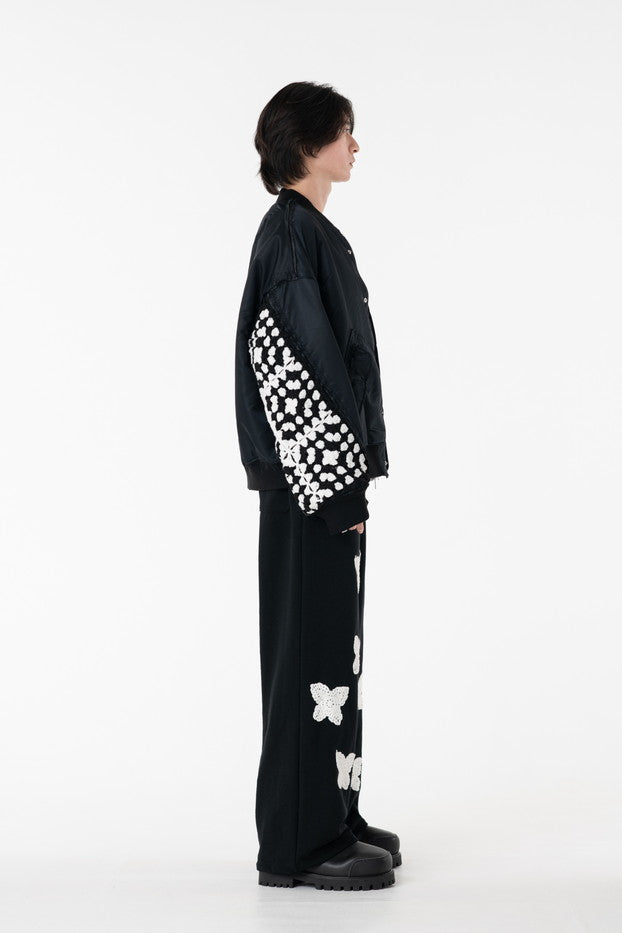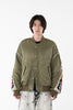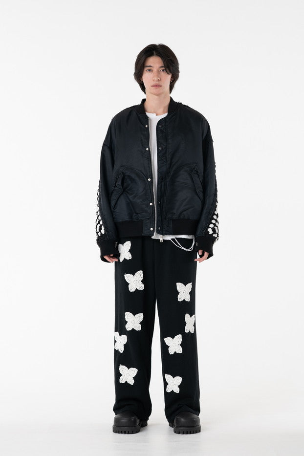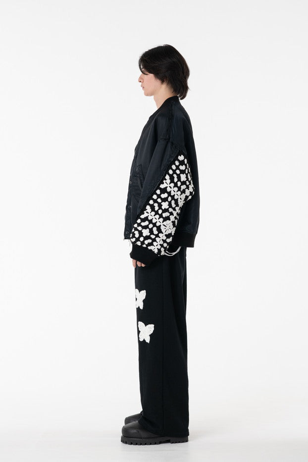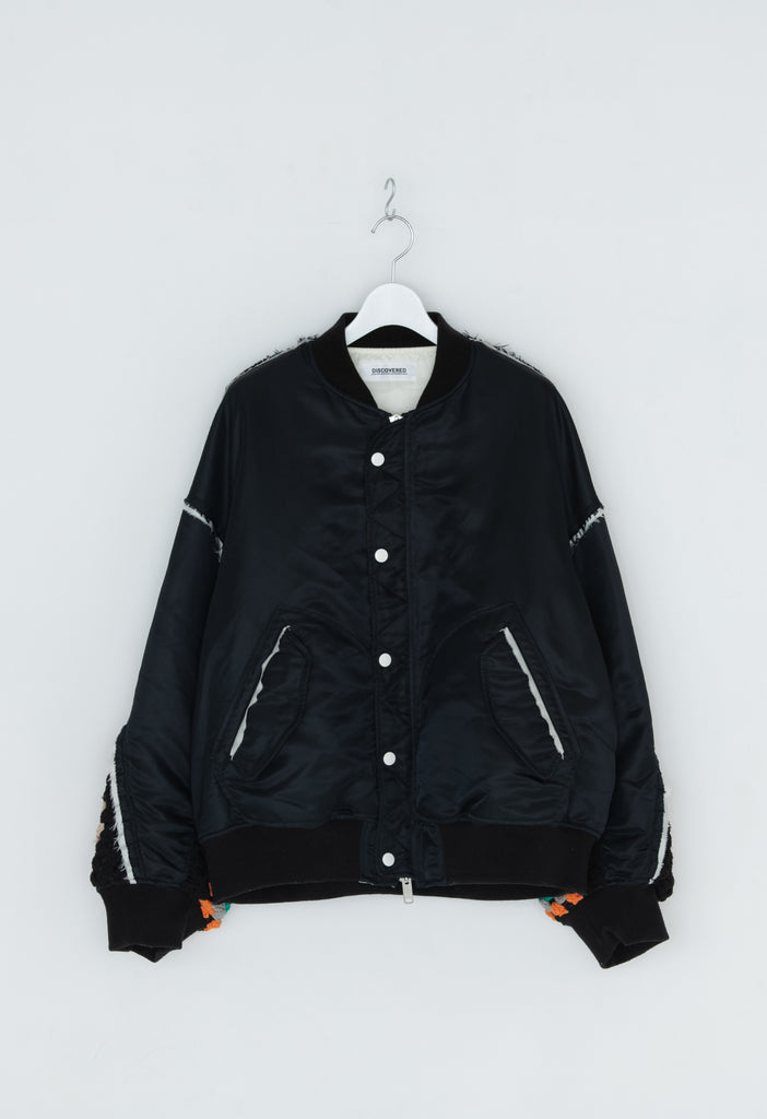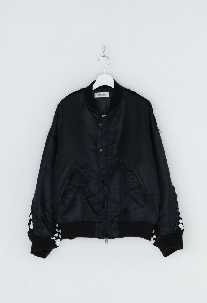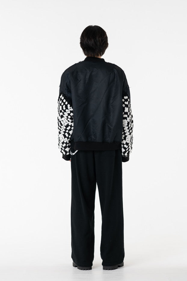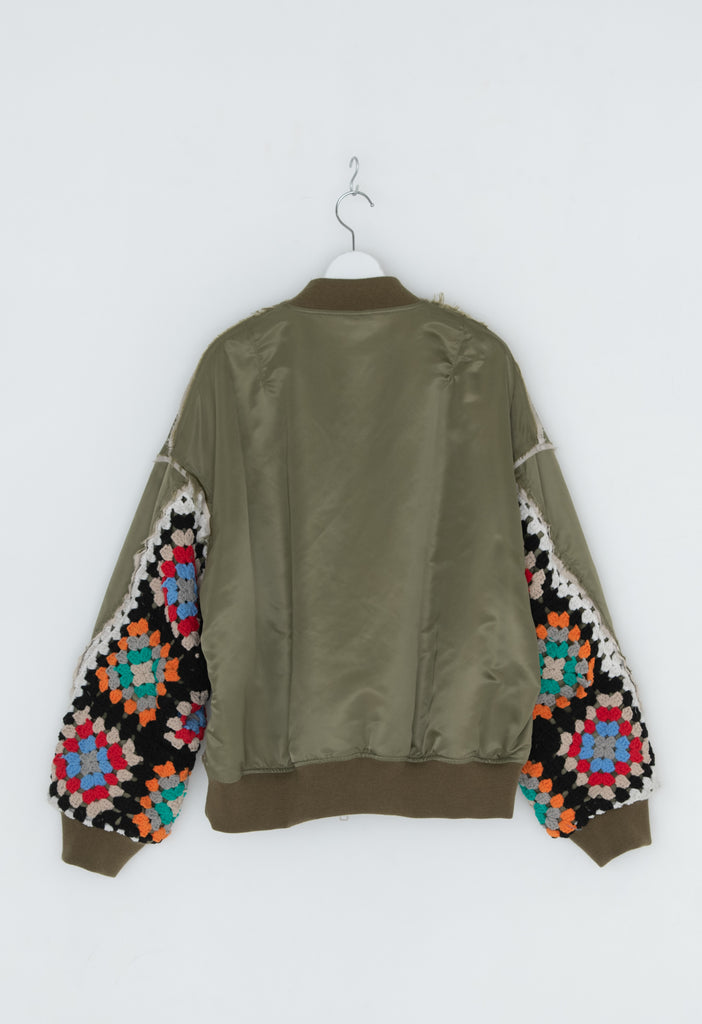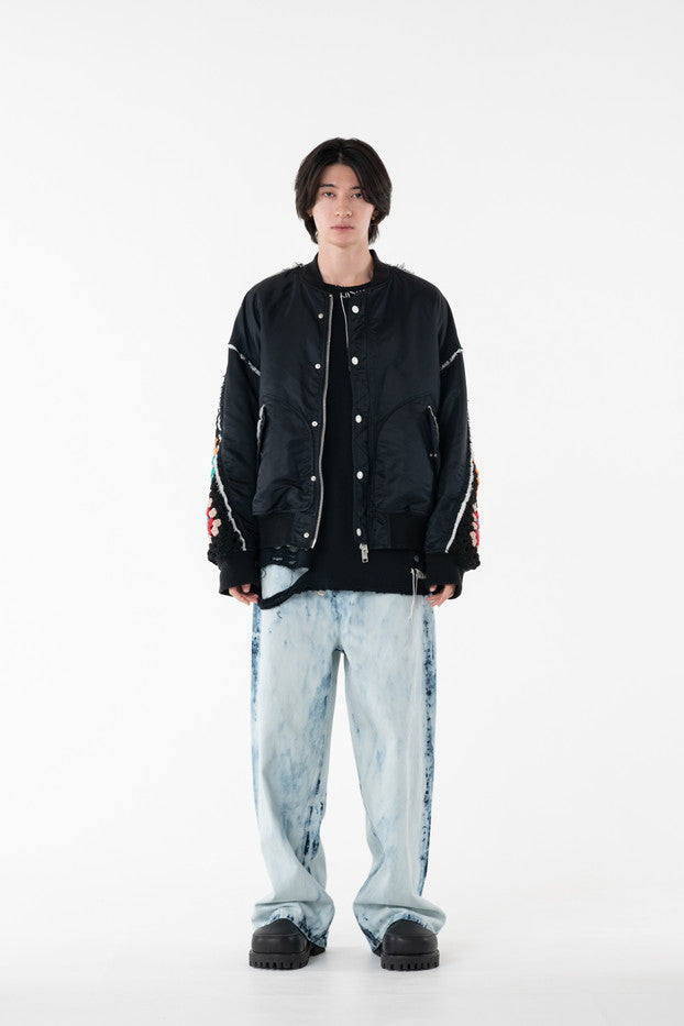 イタリアのリモンタ社の撥水加工されたナイロンを使用したリラックスしたシルエットのMA-1ブルゾン。インサイドアウトのデザインと袖の手編みによるかぎ針編みのニット切り替えデザインがポイントとなったアイテム。サイズ1[cm]:着丈68 肩幅69 身幅78.5 袖丈58サイズ3[cm]:着丈71 肩幅71 身幅81 袖丈61素材:NYLON100% [裏地]POLYESTER100%モデル(185m/64kg)着用サイズ:3