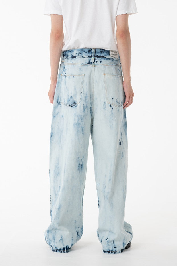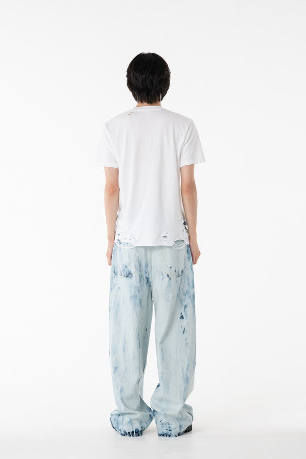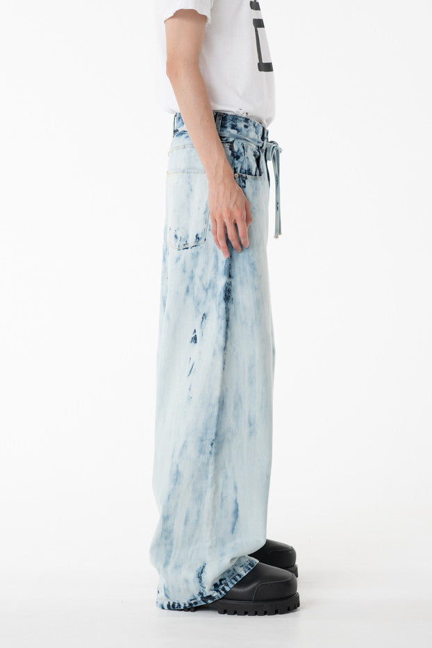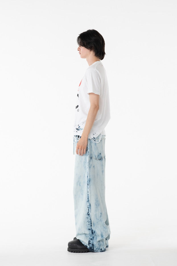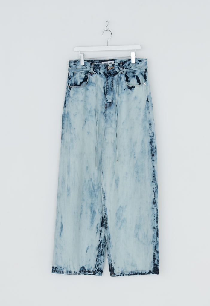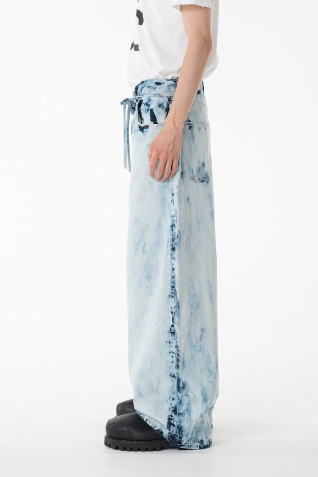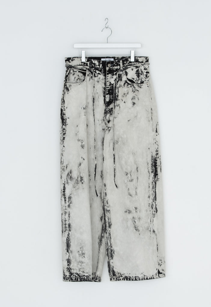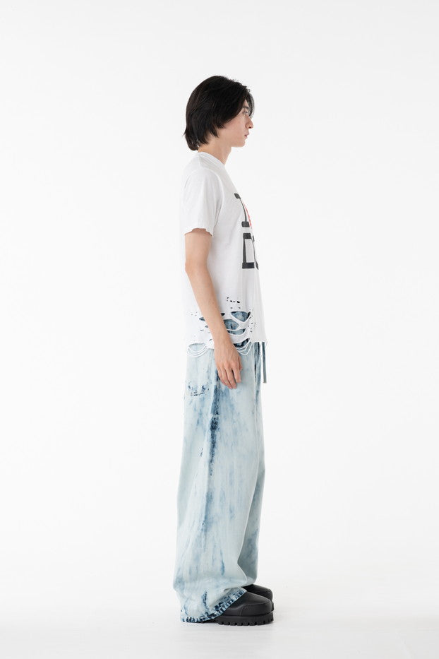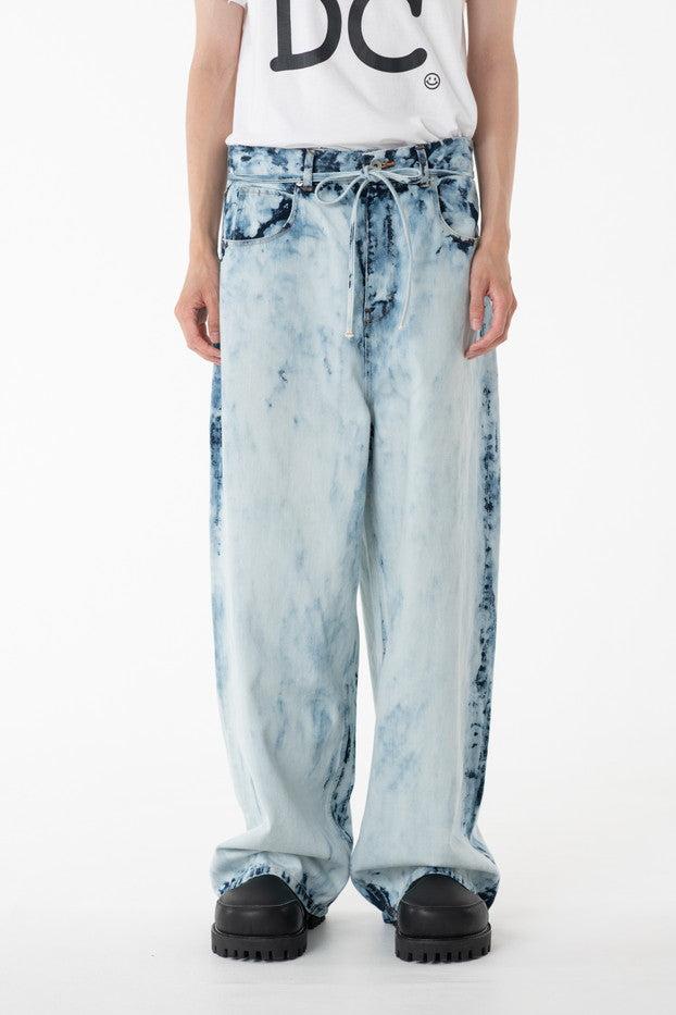 12ozの縦⽷✖ムラ⽷の凹凸感が出やすい素材を使⽤ したデニムパンツ。今の気分を反映さえたバギーシルエットとバランスの取れたブリーチ加工がインパクト大なアイテム。