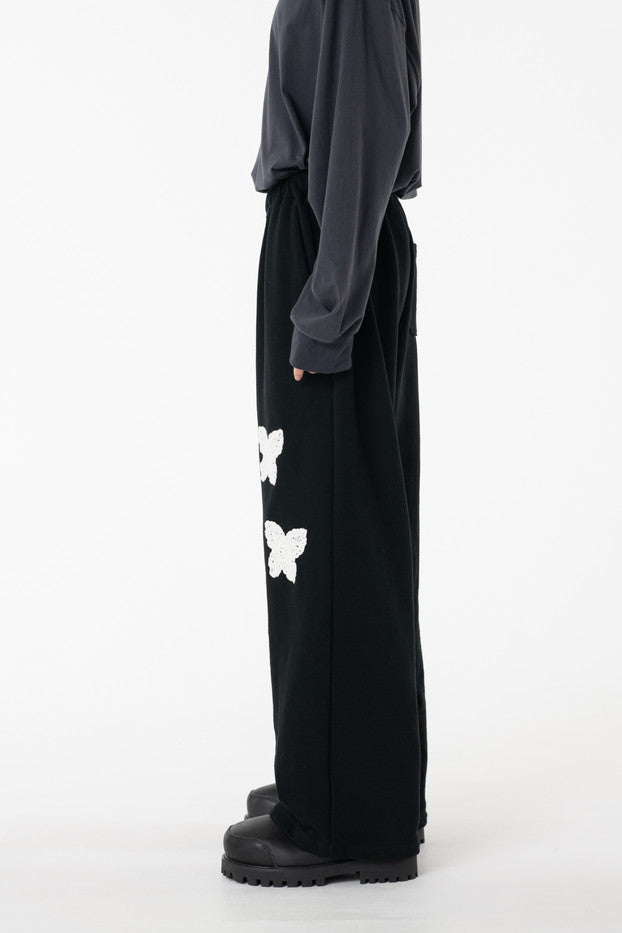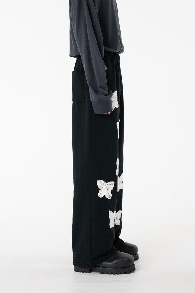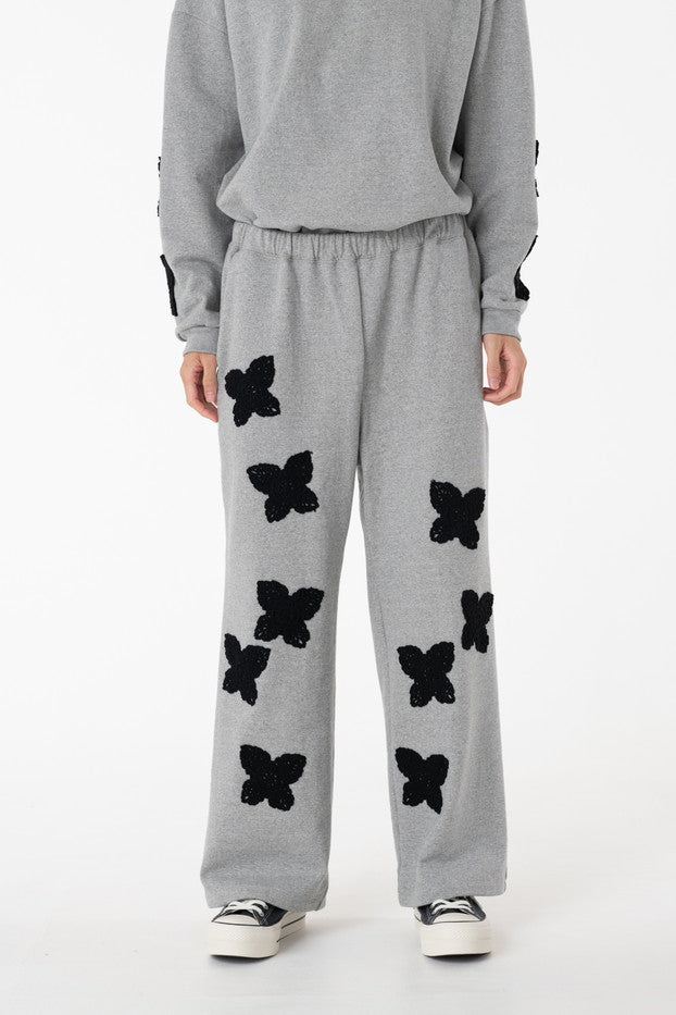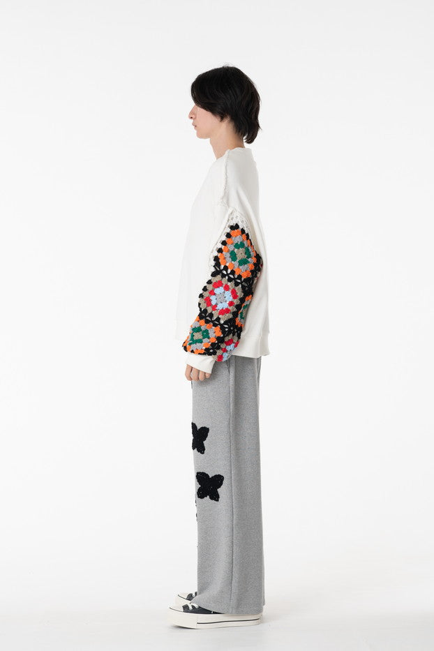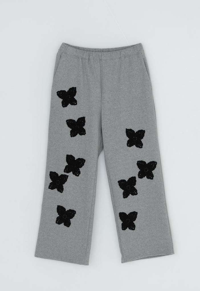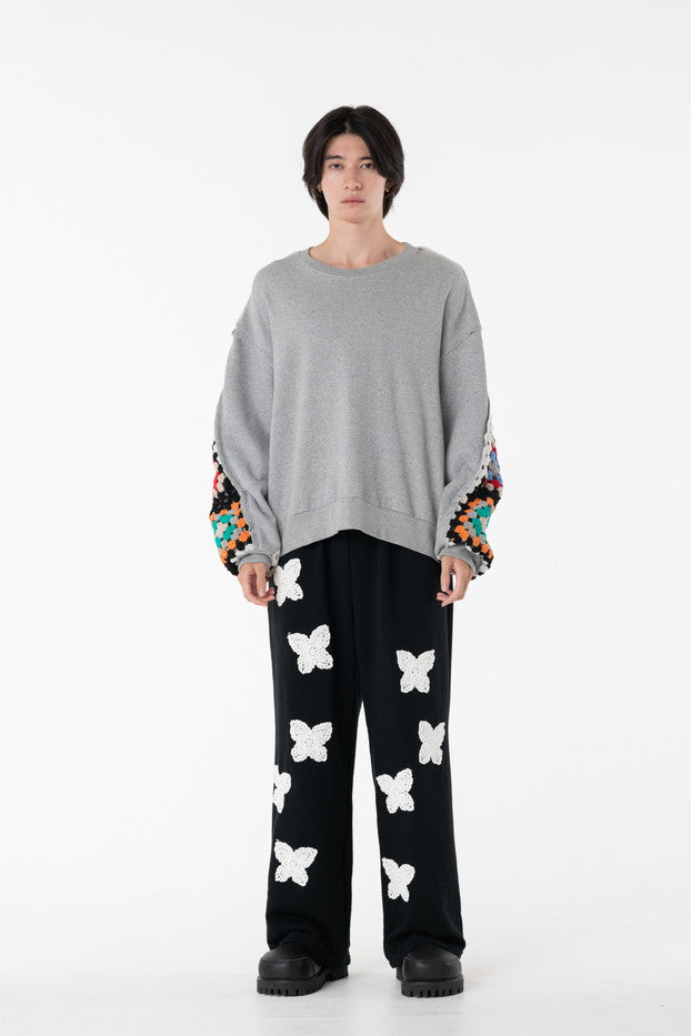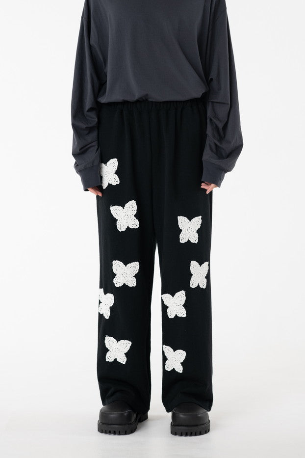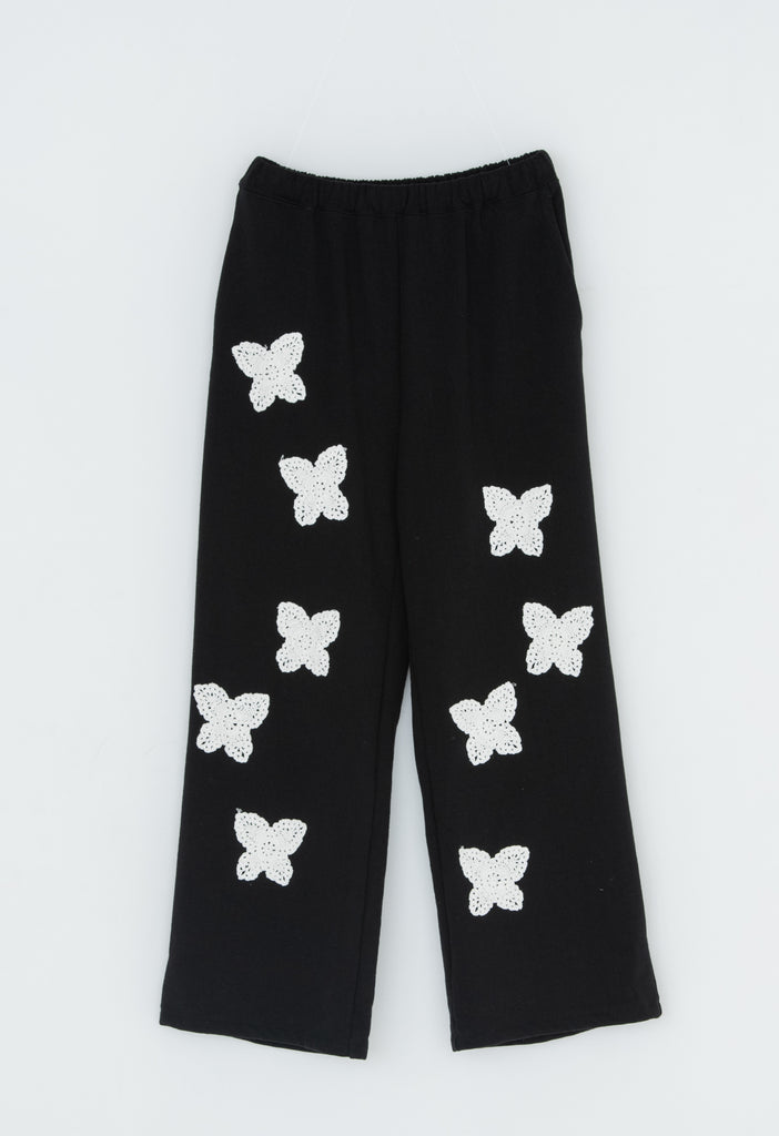 適度な保温性と⾼い吸⽔性がある しっかりとした 20/10裏⽑を使⽤したスウェットパンツ。適度なゆとりのあるシルエットと手編みで作成された蝶々モチーフのクロシェットがポイントとなったアイテム。