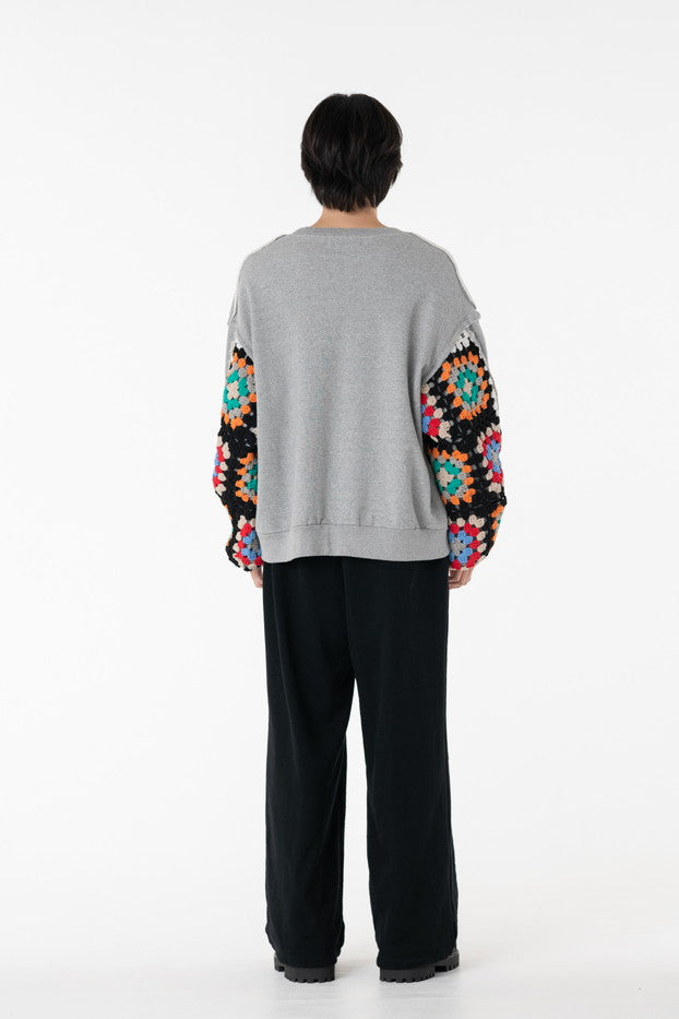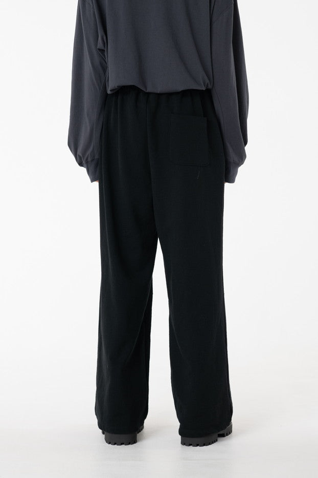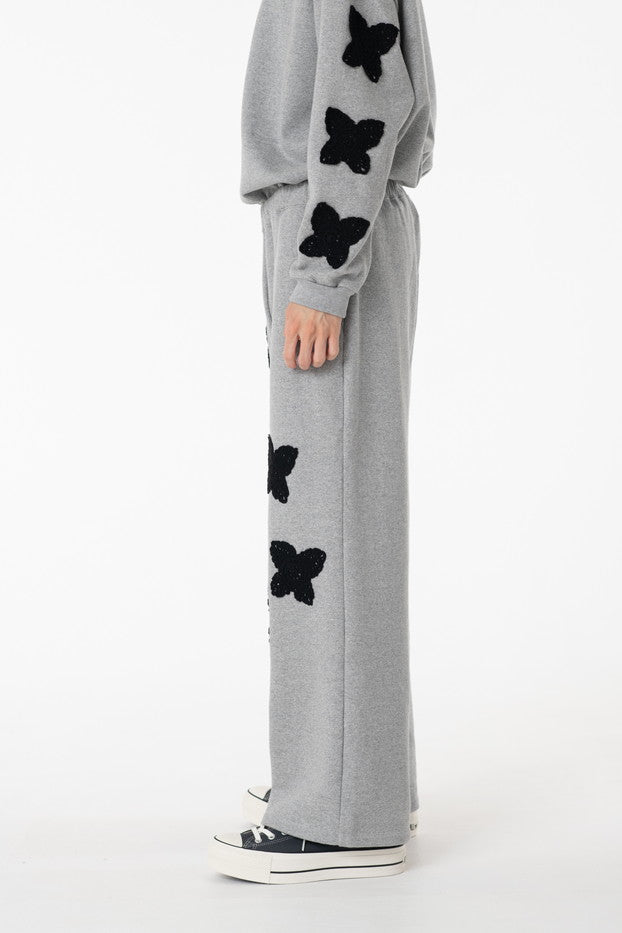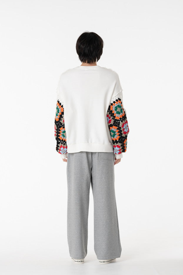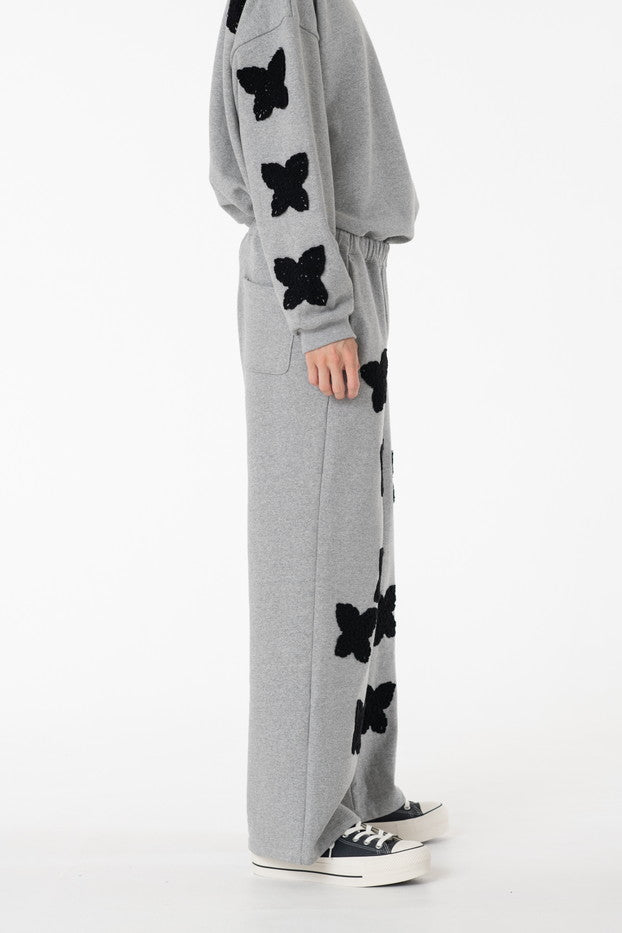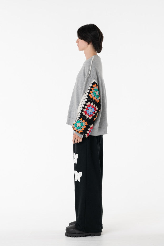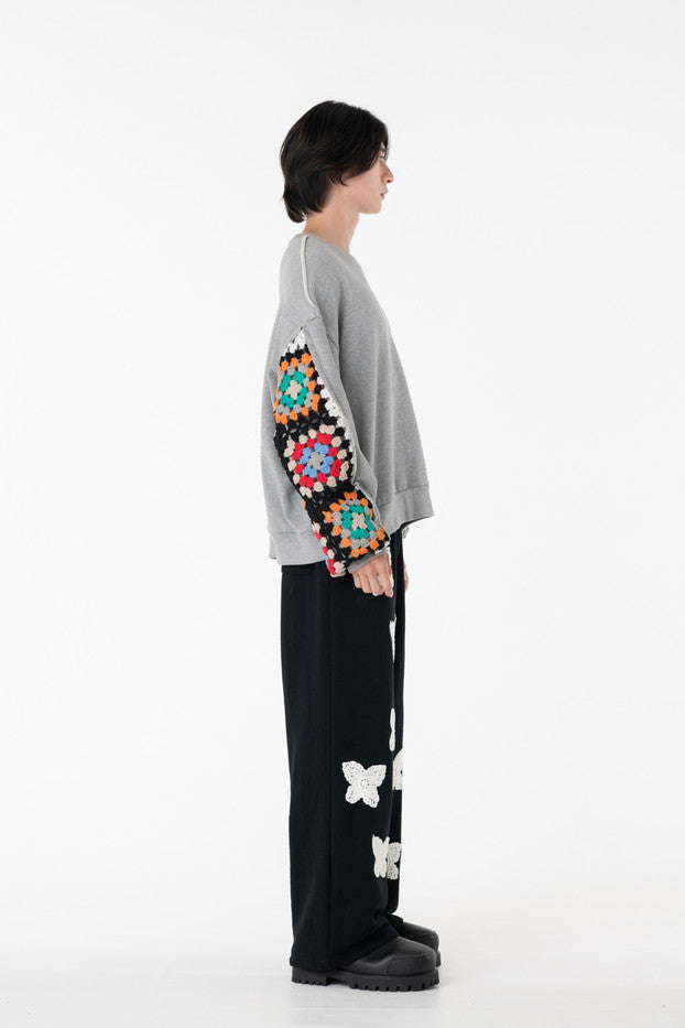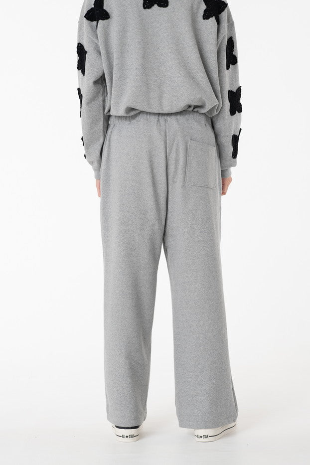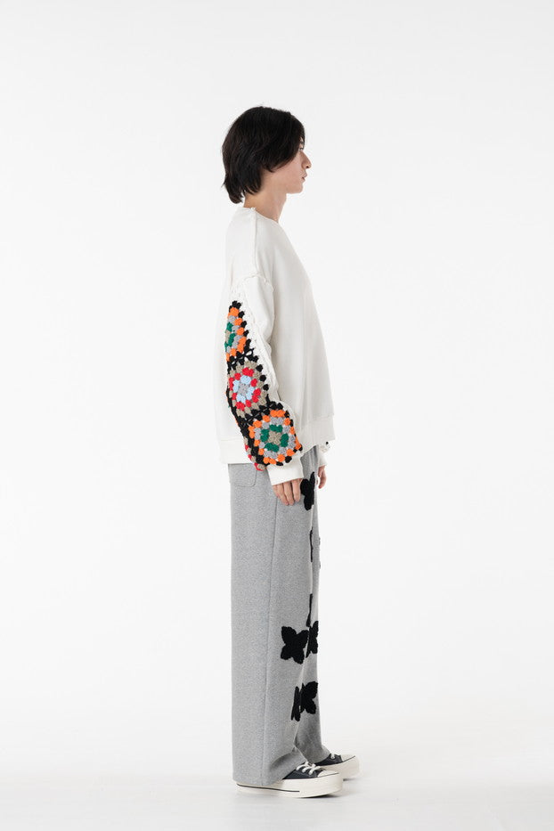 適度な保温性と⾼い吸⽔性がある しっかりとした 20/10裏⽑を使⽤したスウェットパンツ。適度なゆとりのあるシルエットと手編みで作成された蝶々モチーフのクロシェットがポイントとなったアイテム。