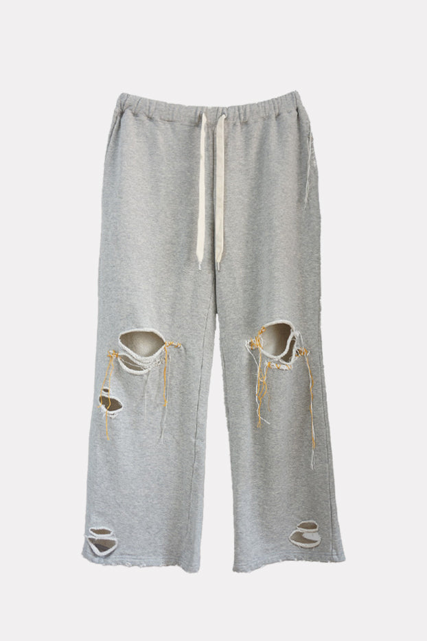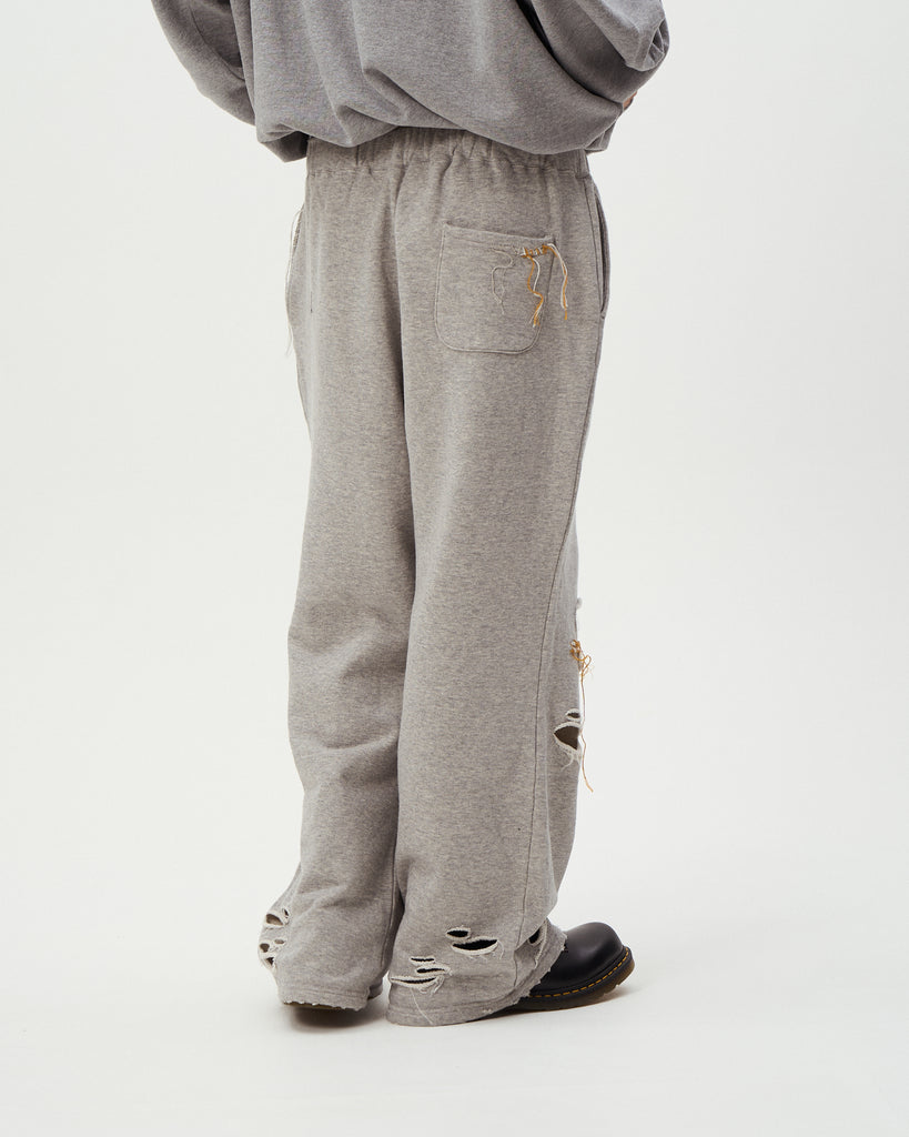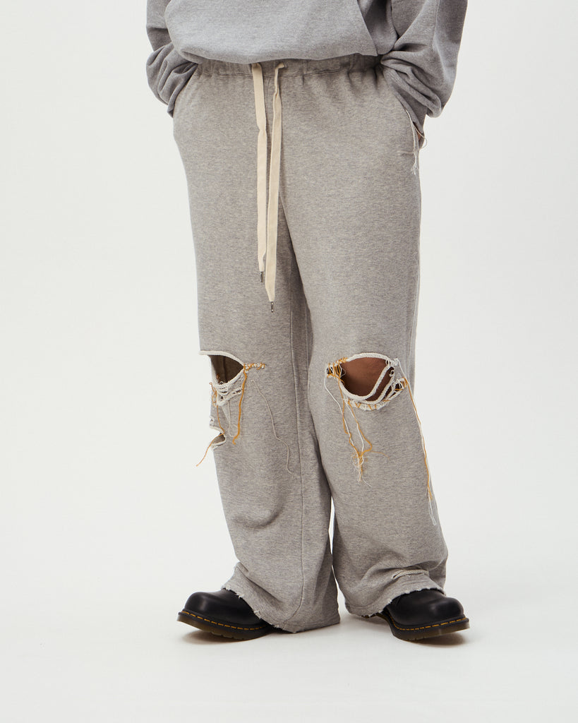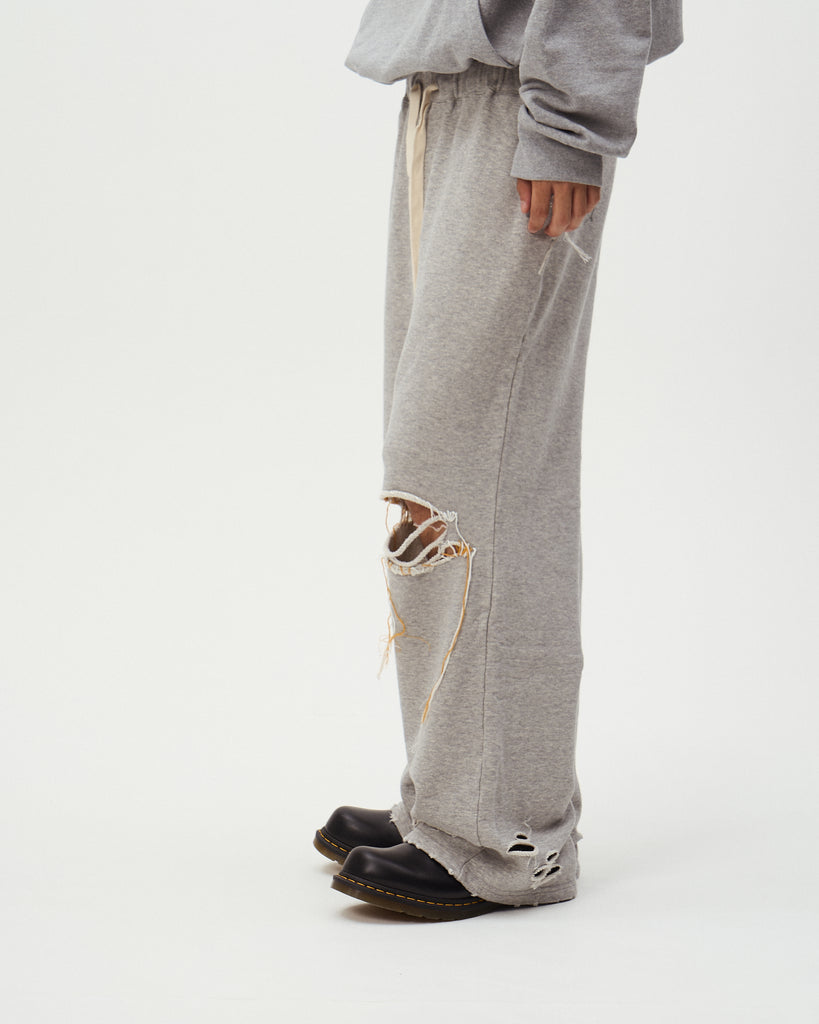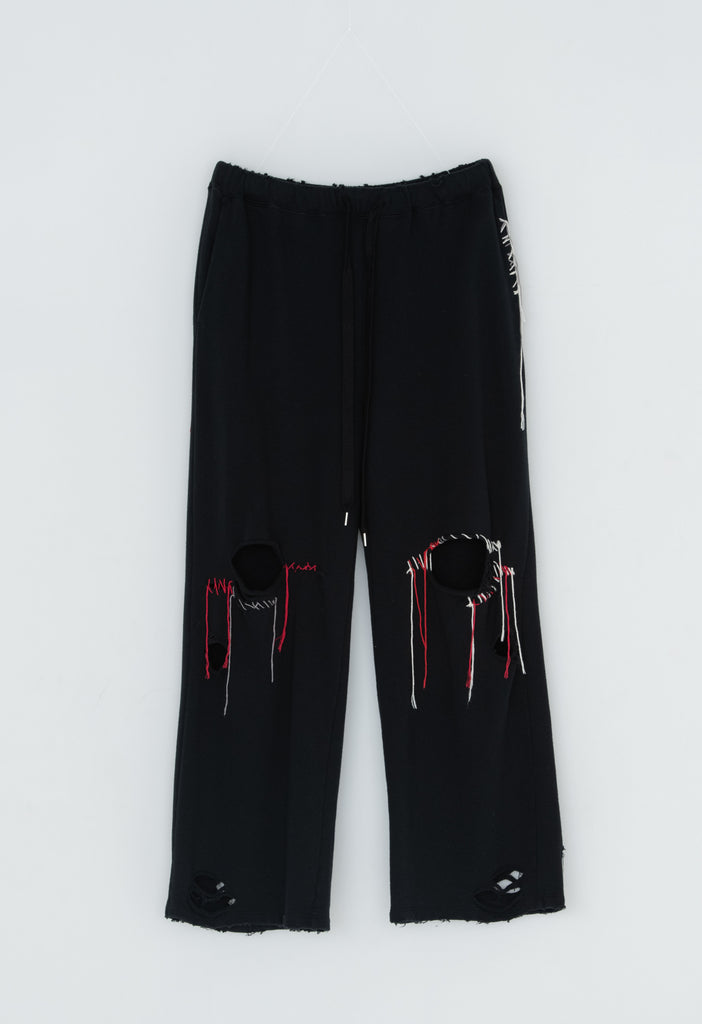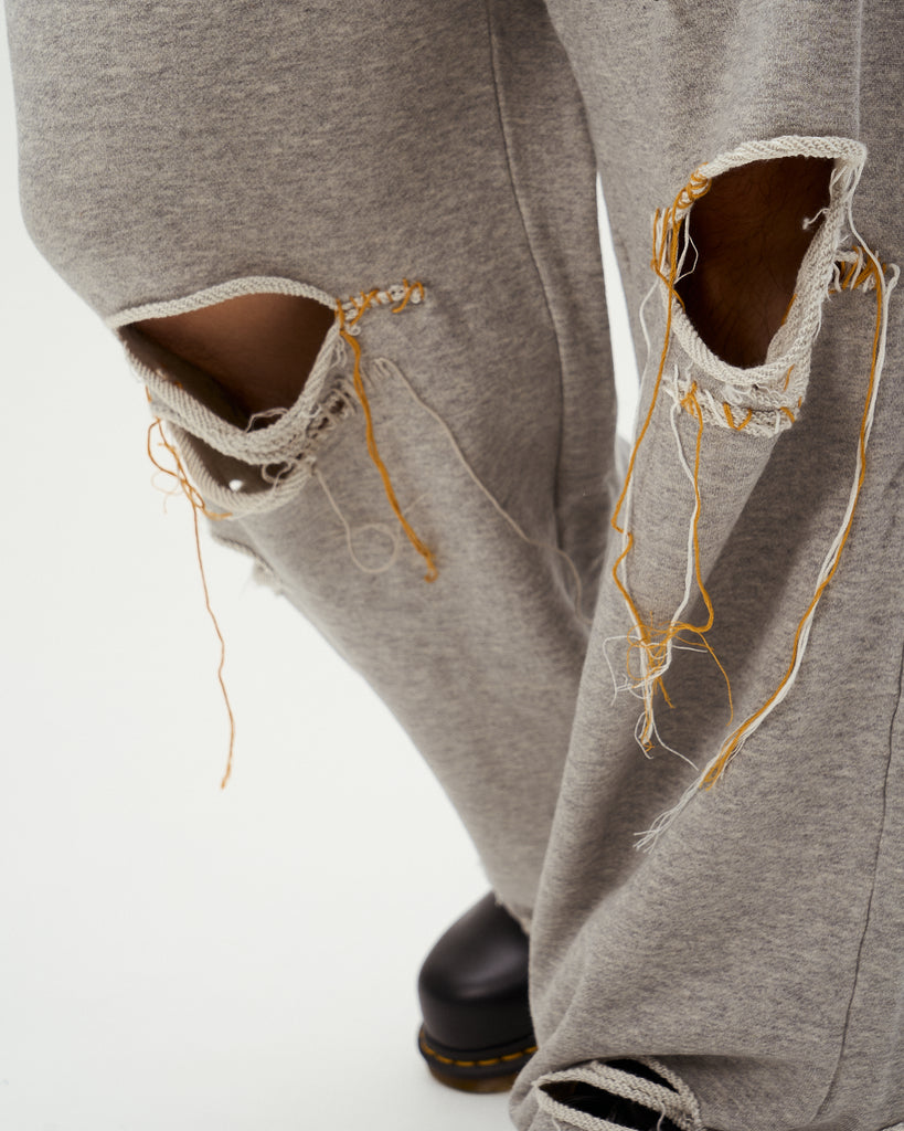 ベーシックな30/10裏⽑を使⽤したリラックスしたシルエットが特徴的なスウェットパンツ。バランス をとり施したダメージ加⼯とハンドステッチが程よいバランスのアイテム。
