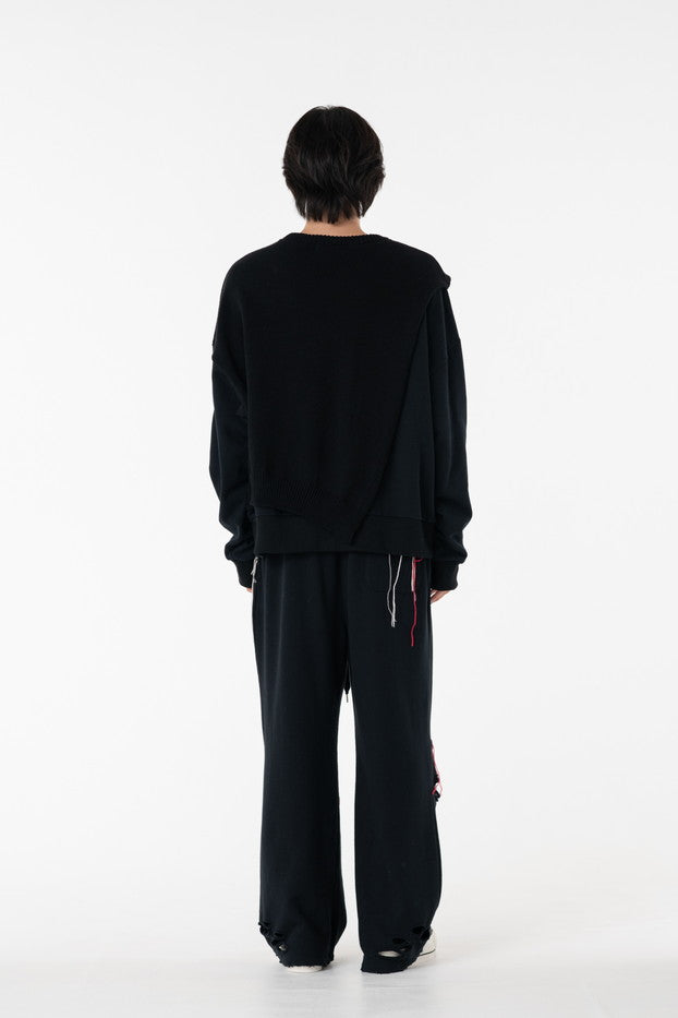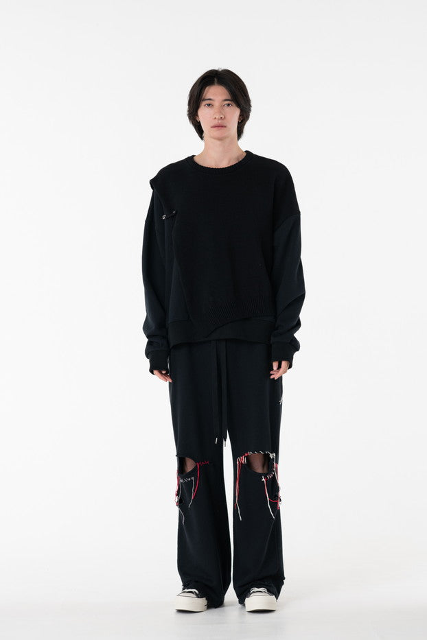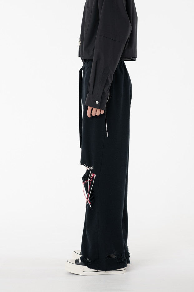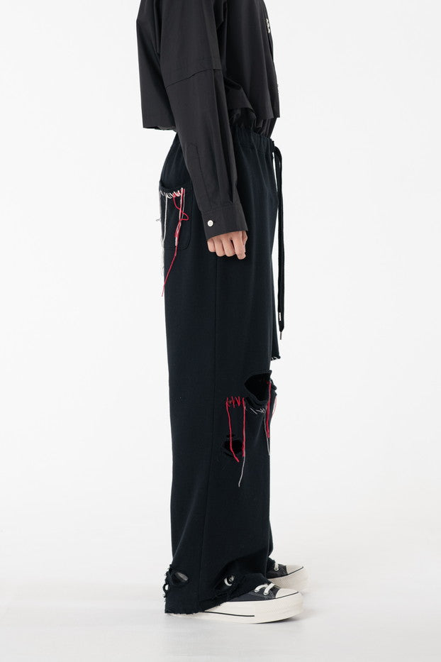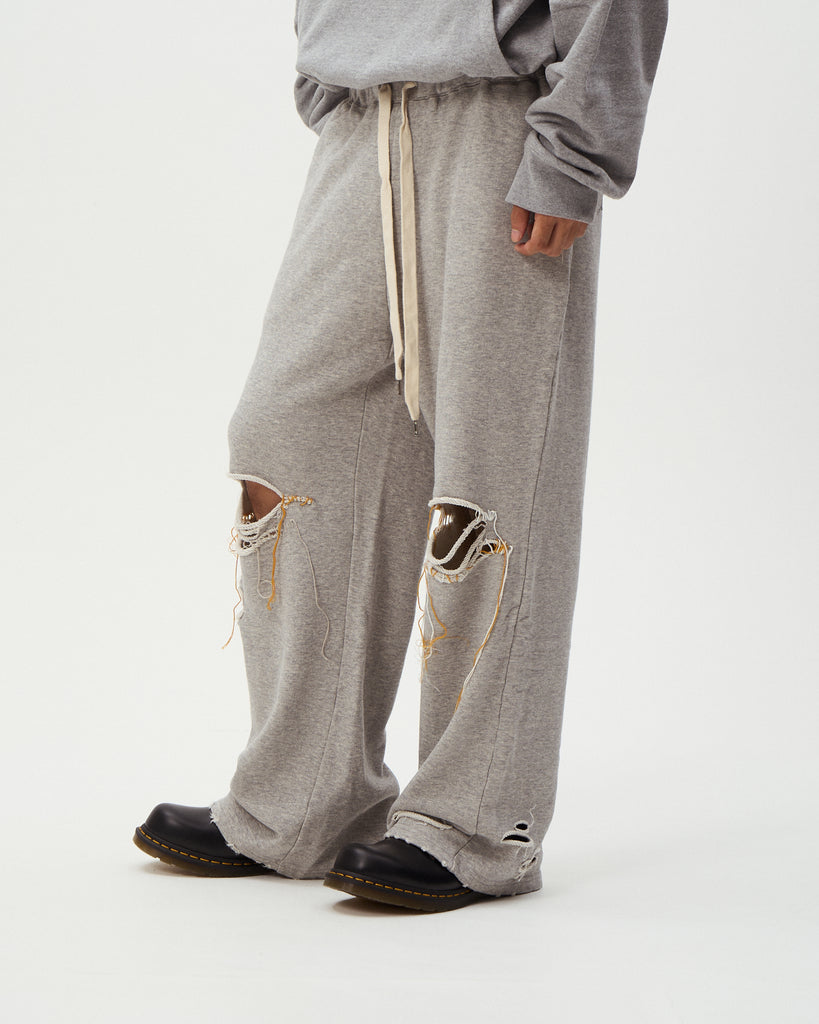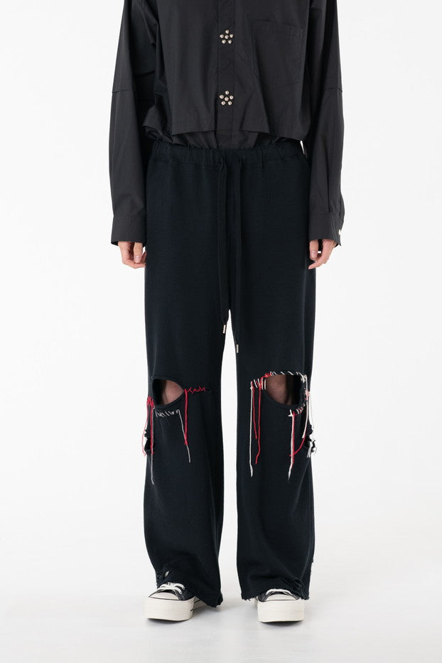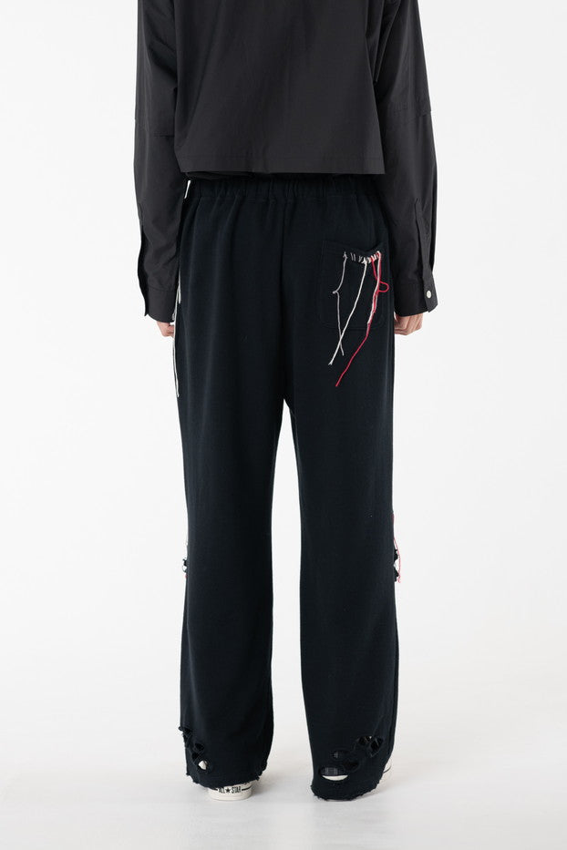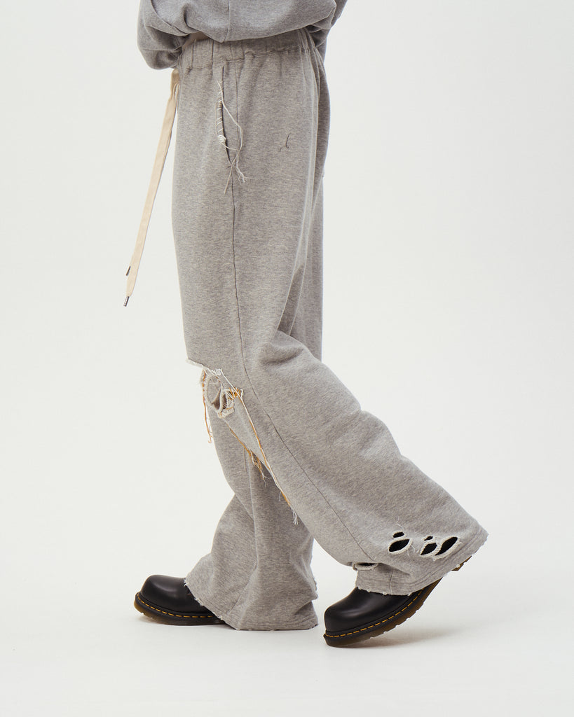 ベーシックな30/10裏⽑を使⽤したリラックスしたシルエットが特徴的なスウェットパンツ。バランス をとり施したダメージ加⼯とハンドステッチが程よいバランスのアイテム。