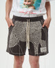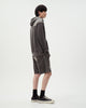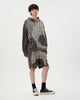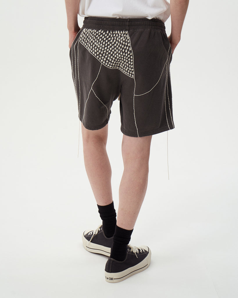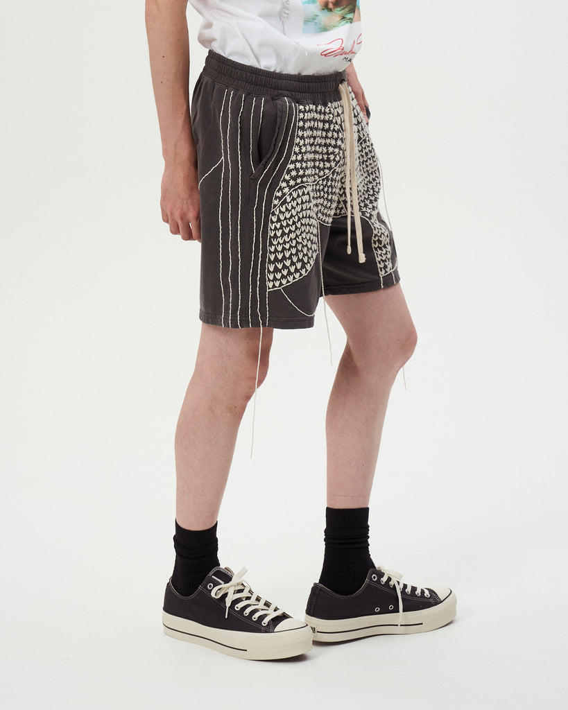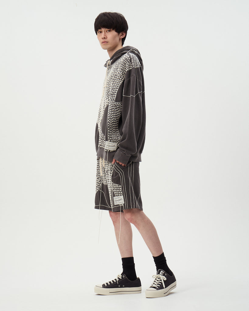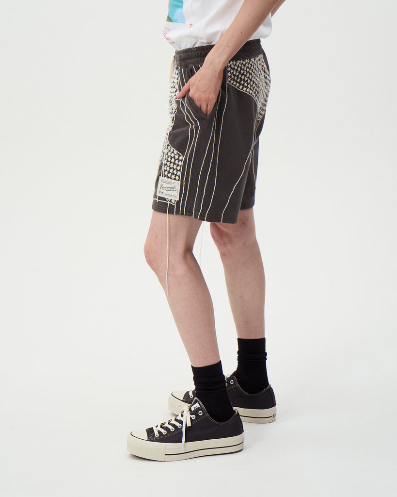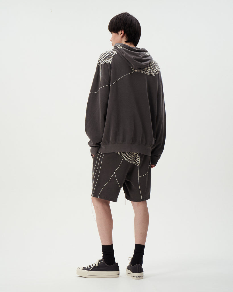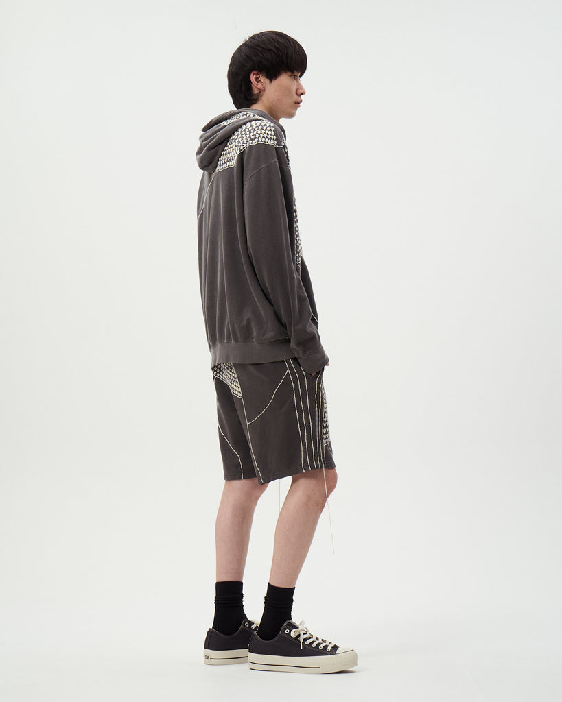 通常のコットンよりも滑らかな手触りを持つ、リングスパンコットンを使用したスウェットショーツ。ガーメントダイによる独特の風合いと部分的に手作業で行われた刺し子の加工がインパクト抜群のアイテム。