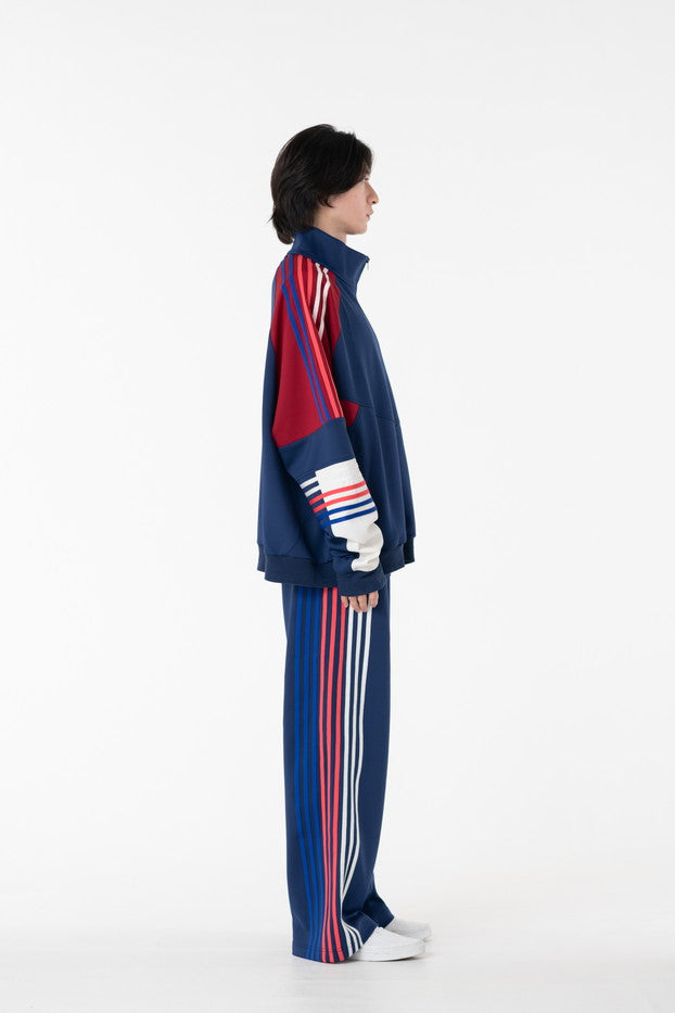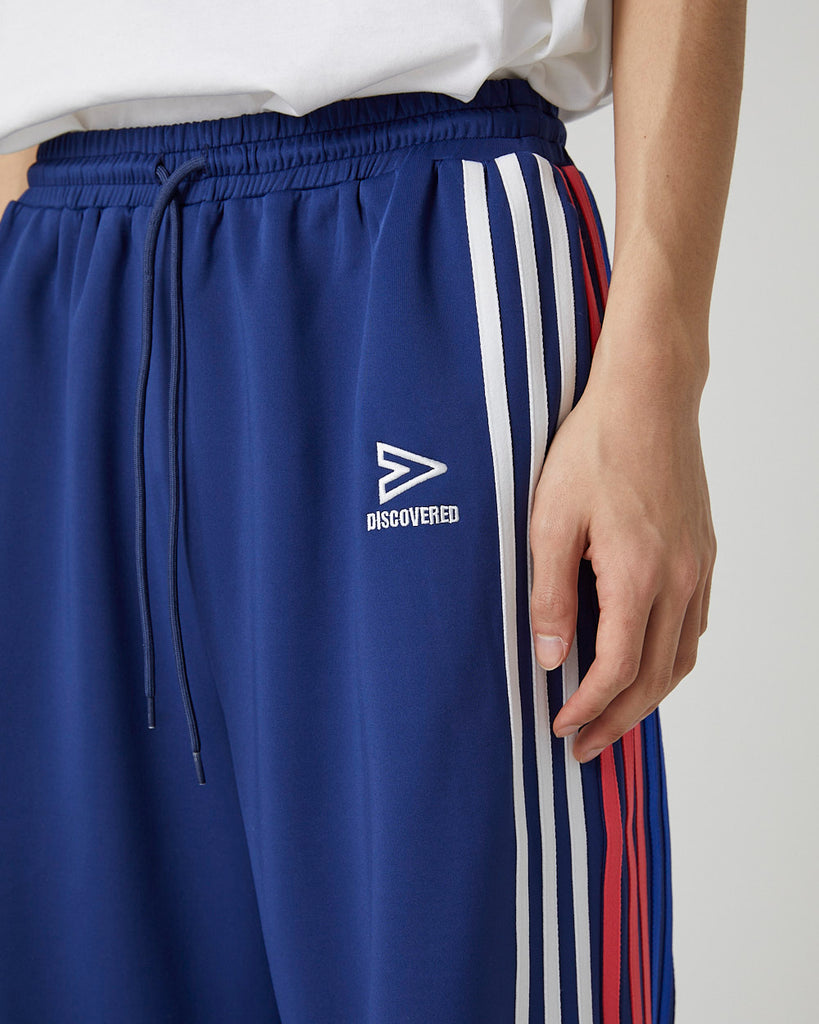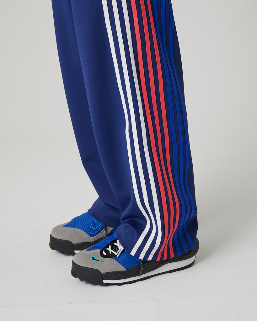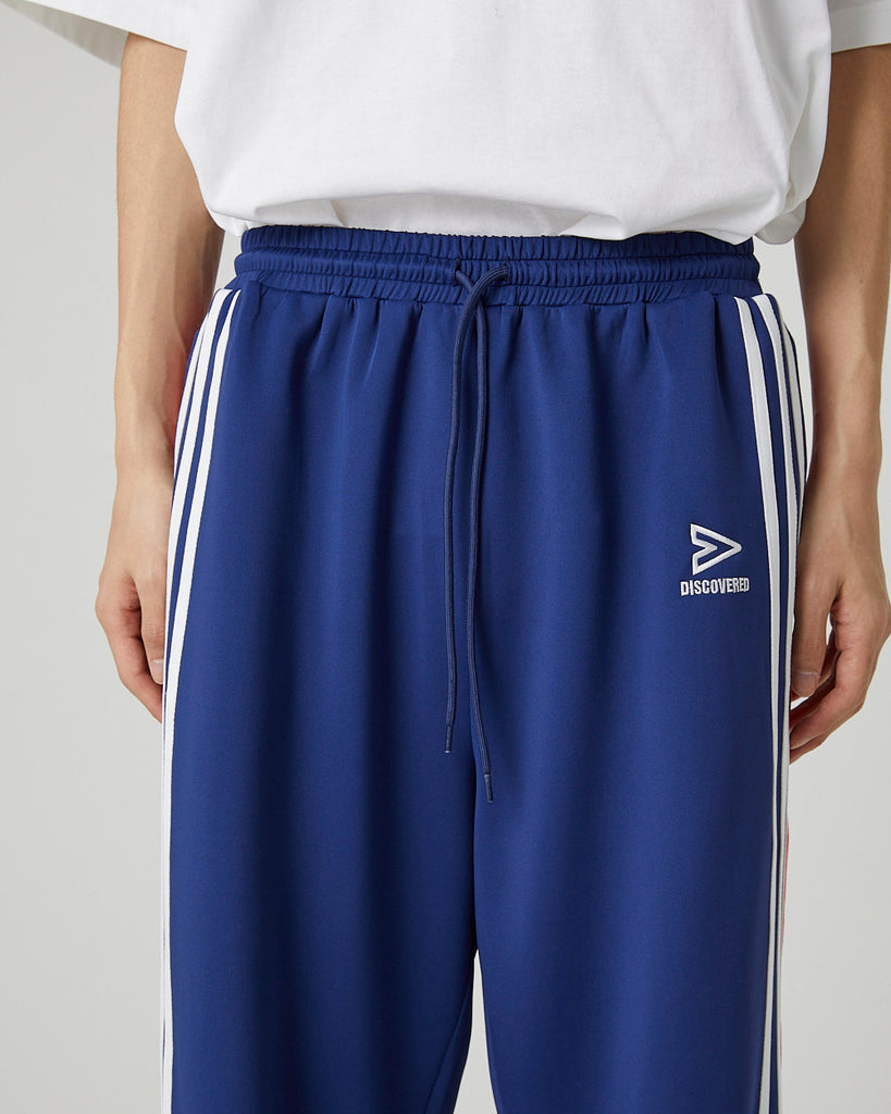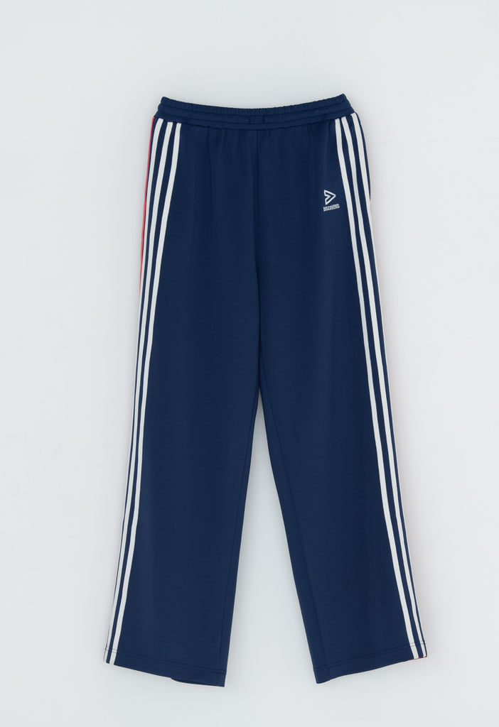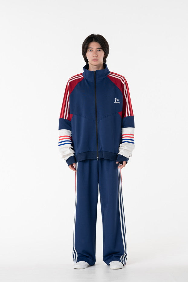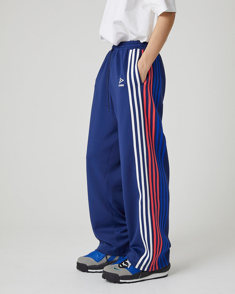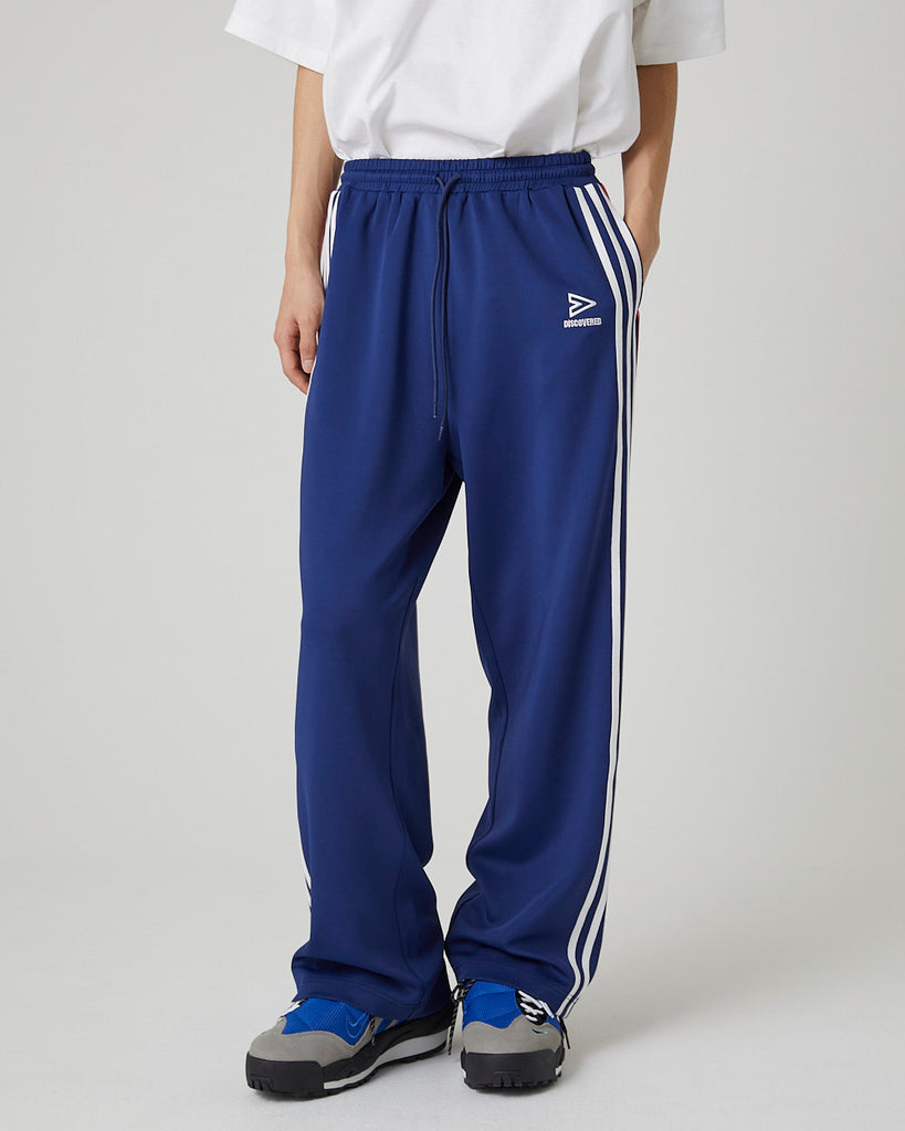 快適性と通気性に優れたポリエステルジャージを使用したトラックパンツ。程よくゆとりのあるシルエットと切替のようなライン使いとワンポイント刺繍が特徴的なアイテム。