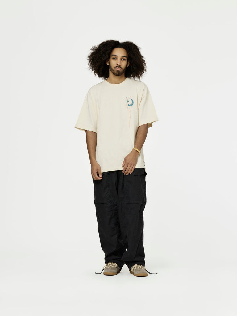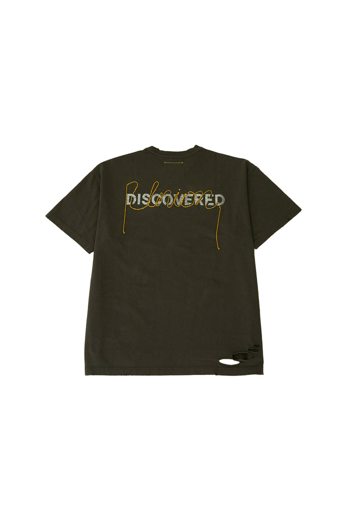 薄⼿でハリのある天竺地を使⽤したダメージ⼊りカ ットソー。バランスをとり施したダメージ加⼯とDISCOVEREDロゴのプリント、ユニオンのトレードマークとロゴのハ ンドステッチがユニークでバランスの良いアイテム。