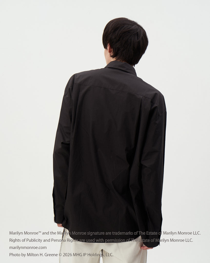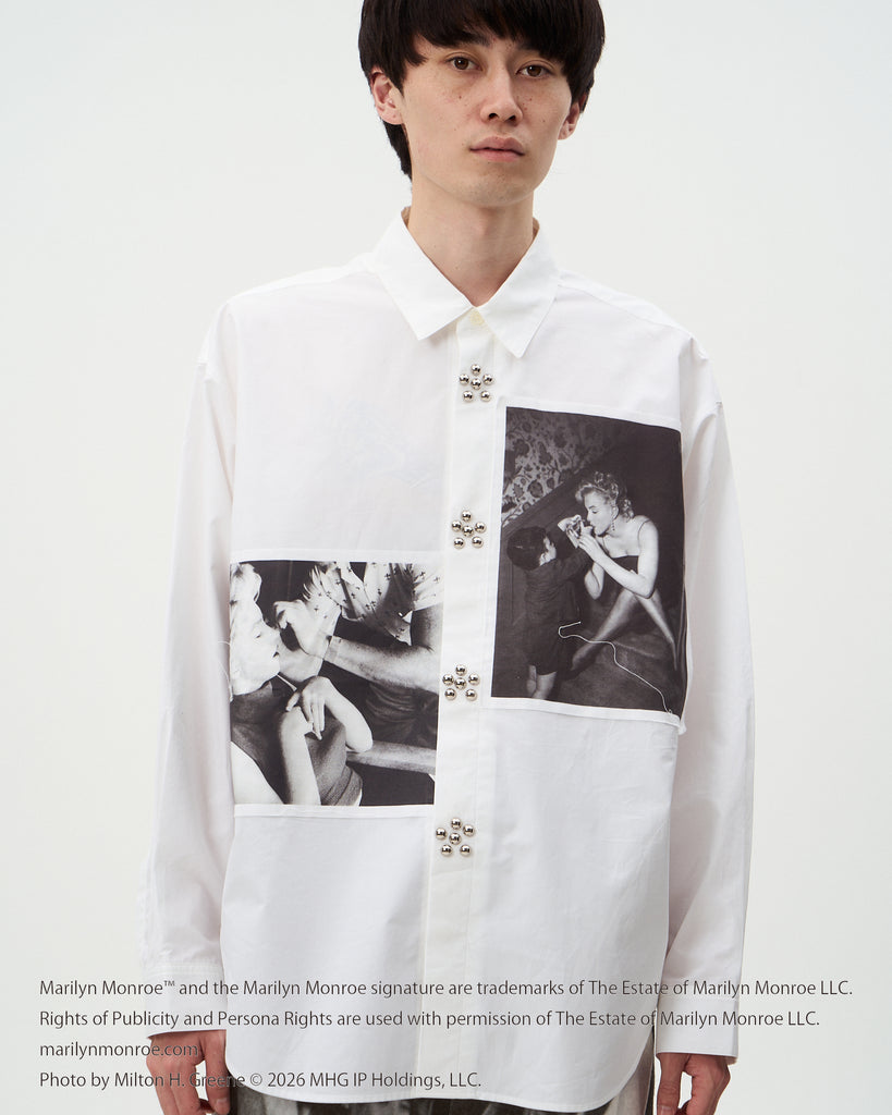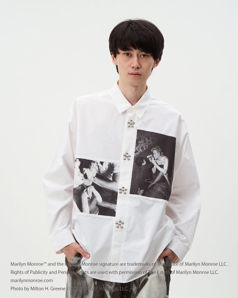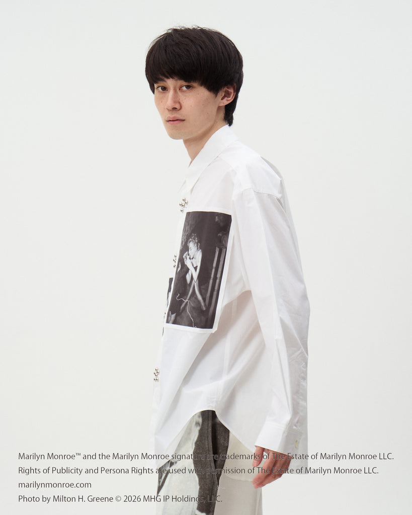 タテ糸の番手を太くし、後染めを施すことで通常のブロードよりも肉厚に仕上げたブロードを使用したレギュラーカラーシャツ。マリリンモンローの写真とランポーニスタッズがキャッチー且つインパクト抜群のアイテム。( Marilyn Monroe Official)