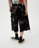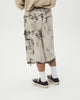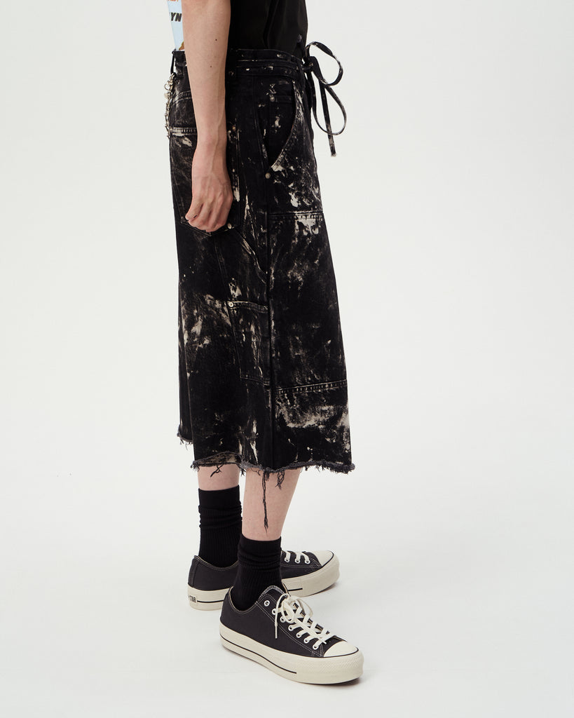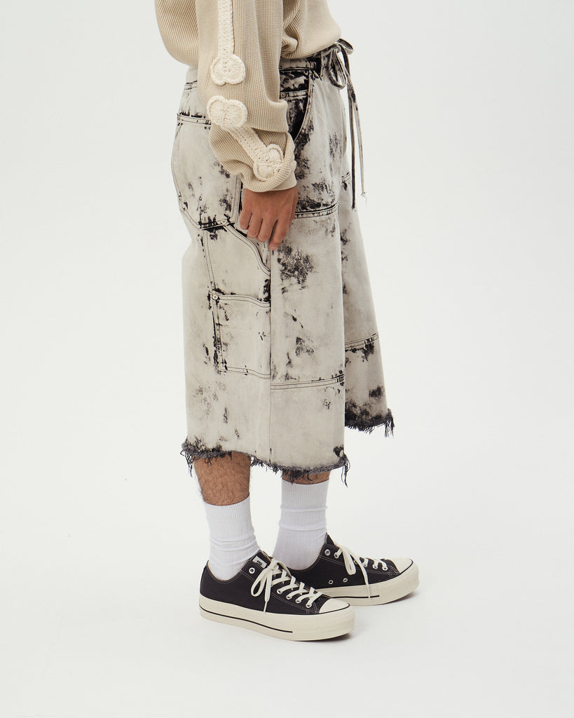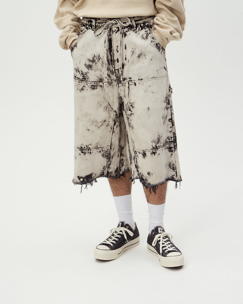 12ozの縦⽷✖ムラ⽷の凹凸感 が出やすい素材を使⽤ した 膝下丈ワイドショーツ。バランスの取れたオーバーシルエットとブリーチ加⼯が表情抜群なアイテム。