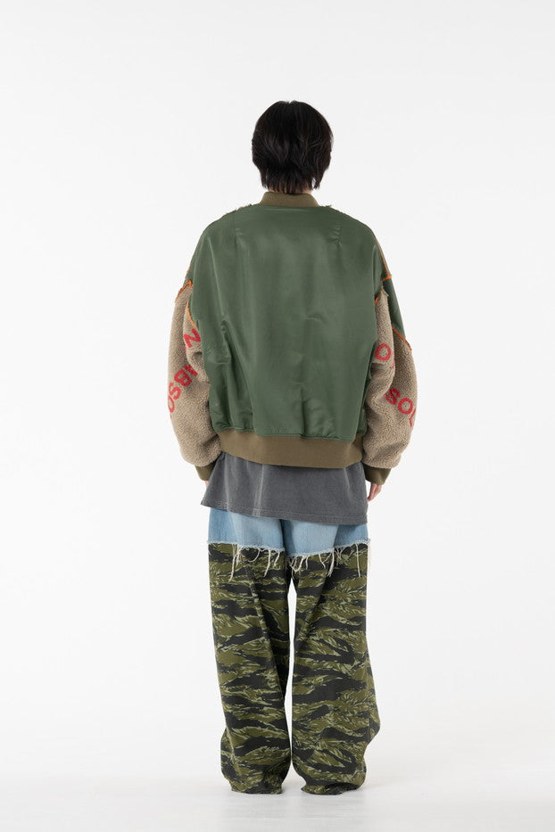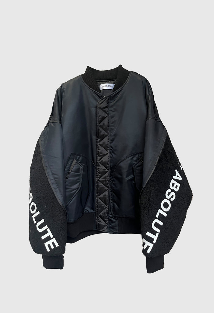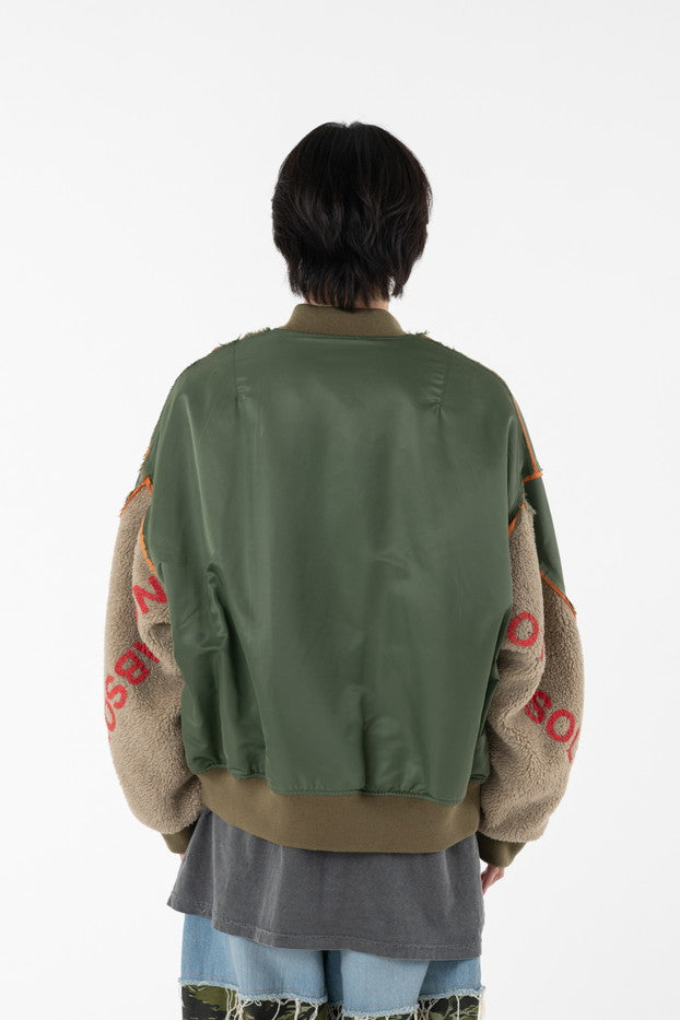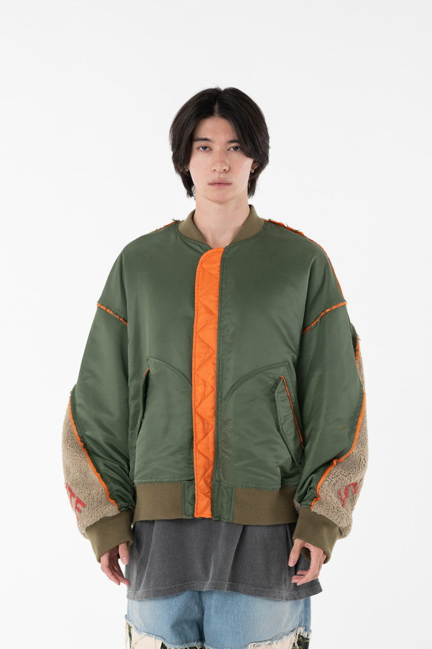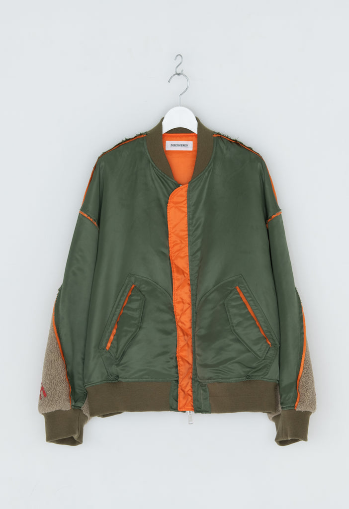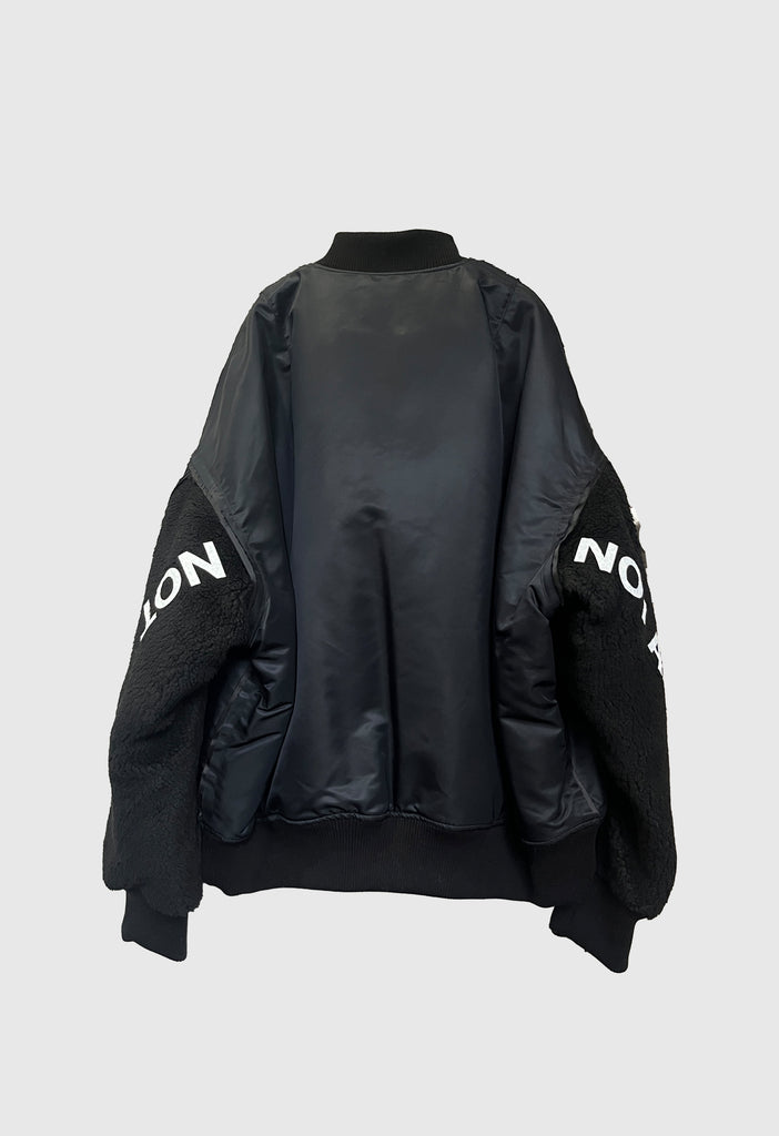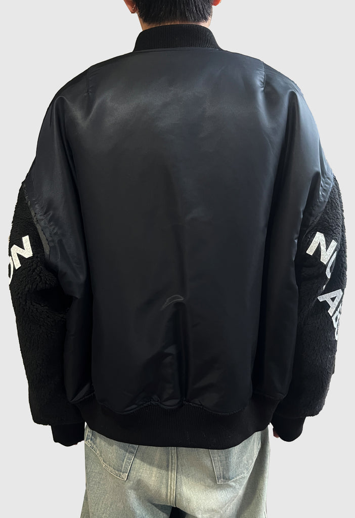 インサイドアウトのデザインと袖のボア切り替えが 特徴的なMA-1ブルゾン。インパクトのあるロゴプ リントとリラックスしたシルエットがポイントとな ったアイテム。