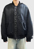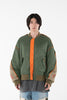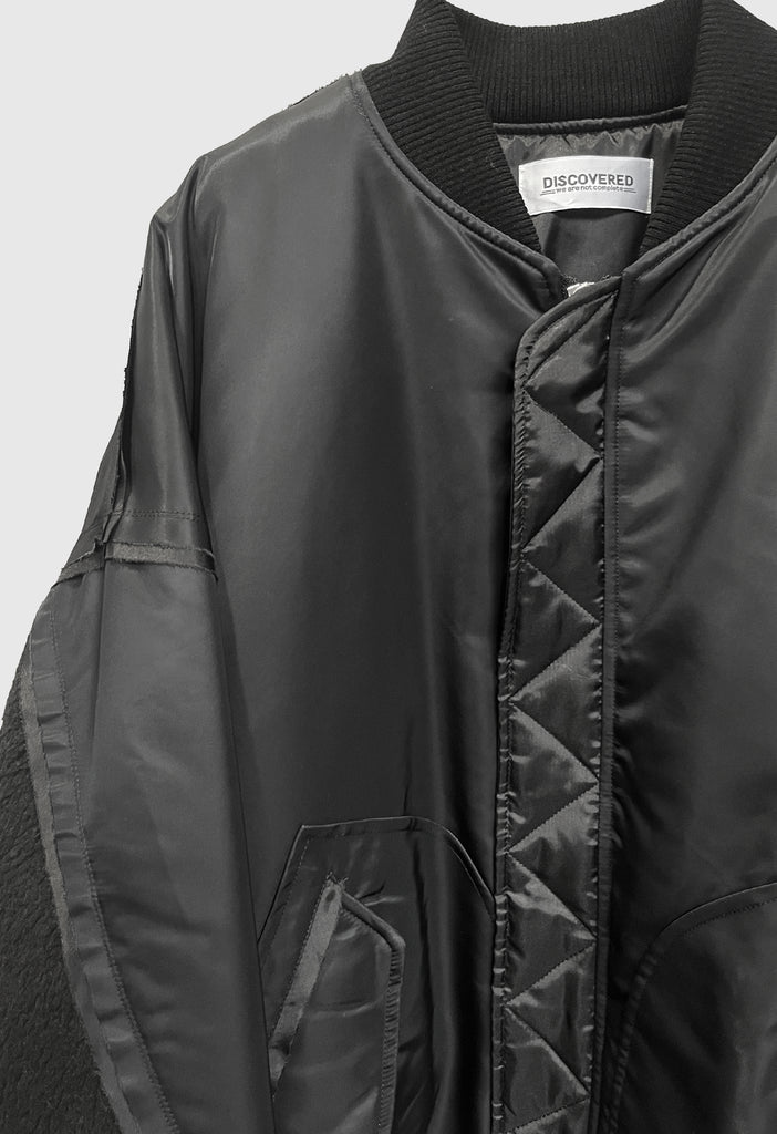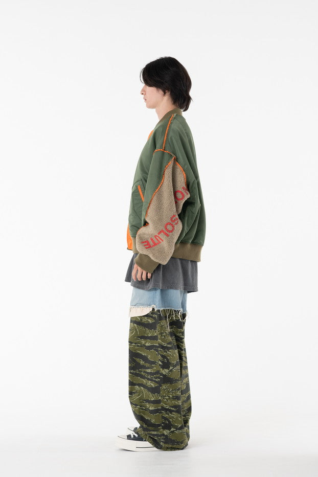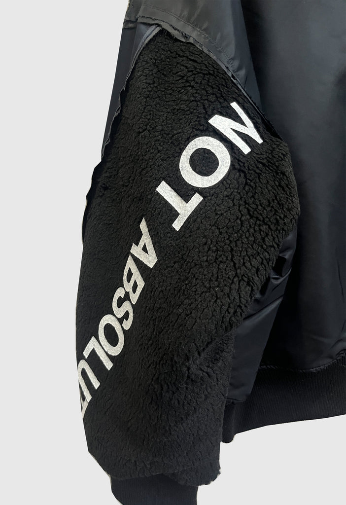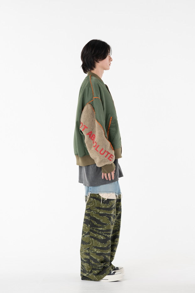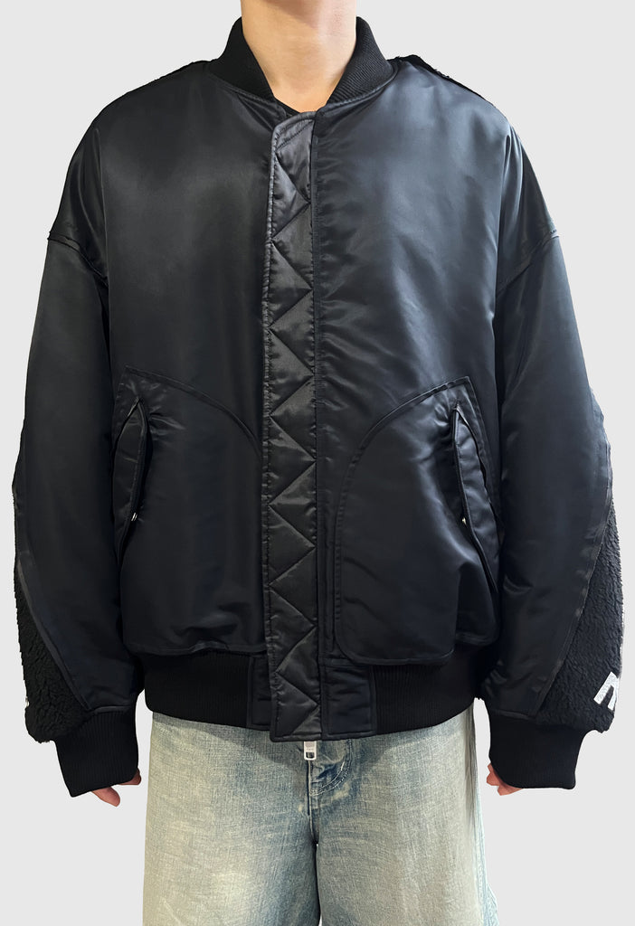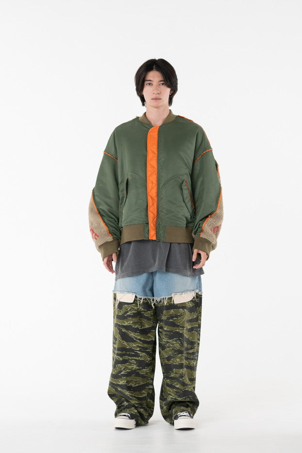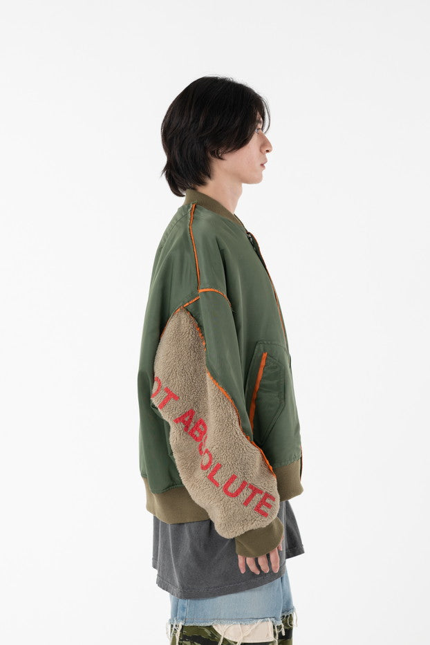 インサイドアウトのデザインと袖のボア切り替えが 特徴的なMA-1ブルゾン。インパクトのあるロゴプ リントとリラックスしたシルエットがポイントとな ったアイテム。