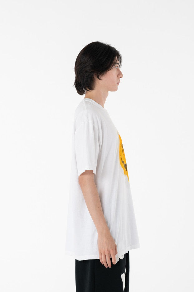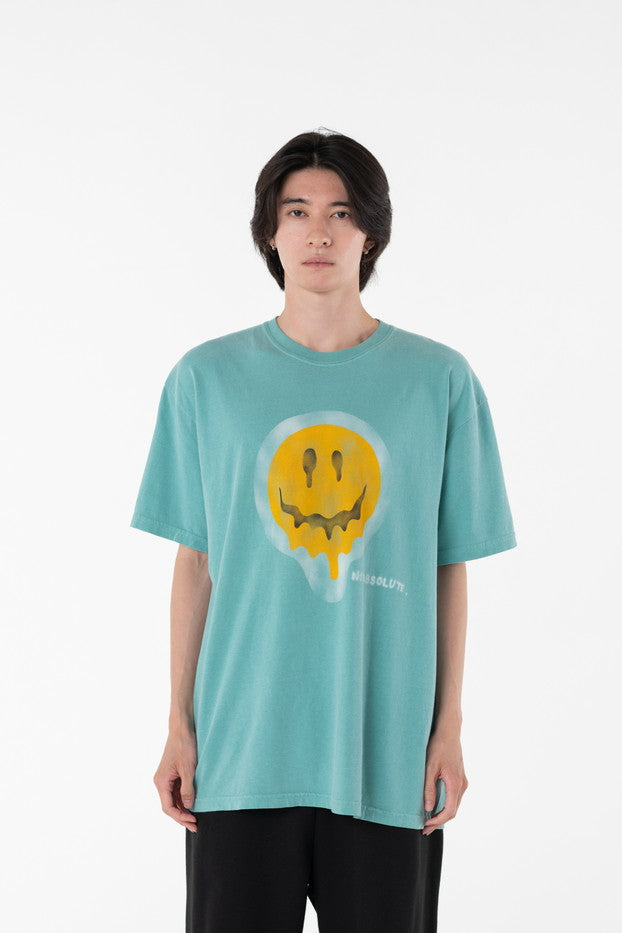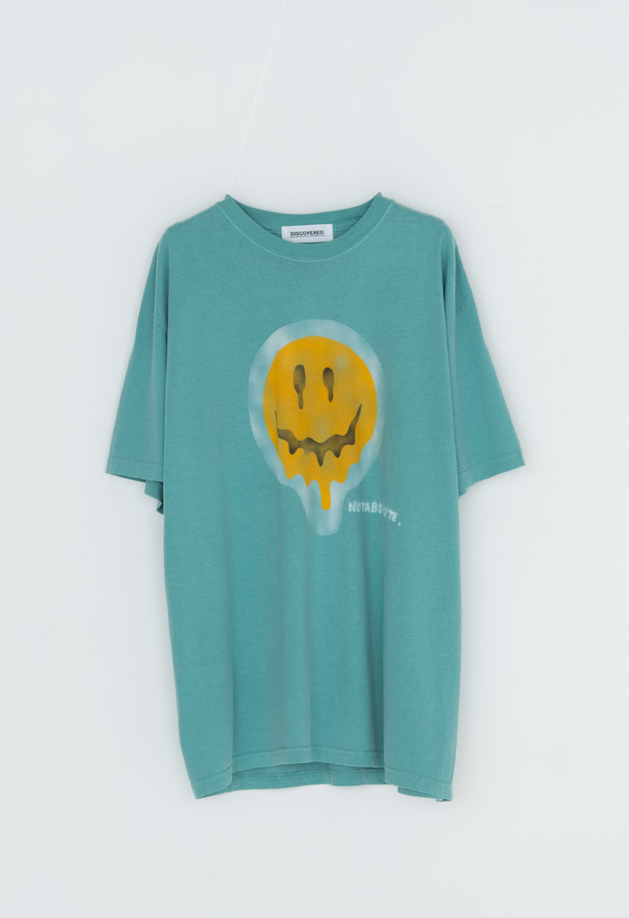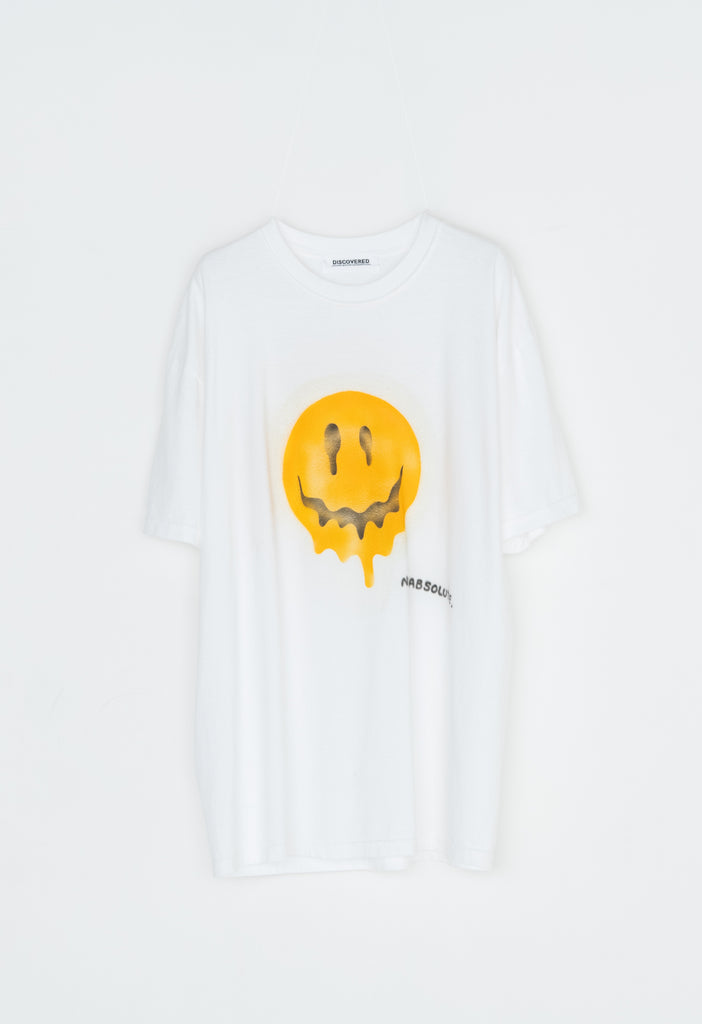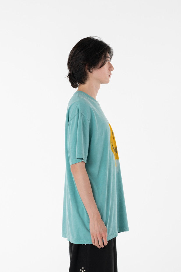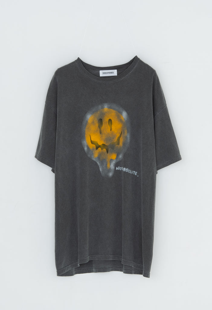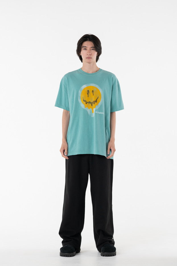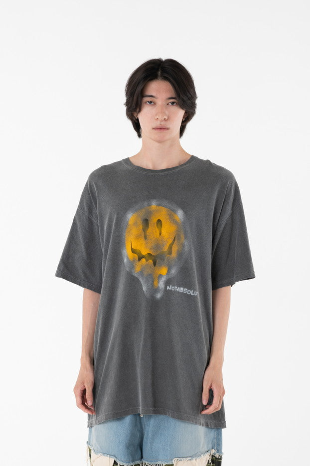 肌触りの良い滑らかなソフト天竺を使用した半袖Tシャツ。淀よくゆとりのあるシルエットとピグメント加工、エアブラシでハンドペイントにて描かれたスマイルマークがポイントとなったアイテム。