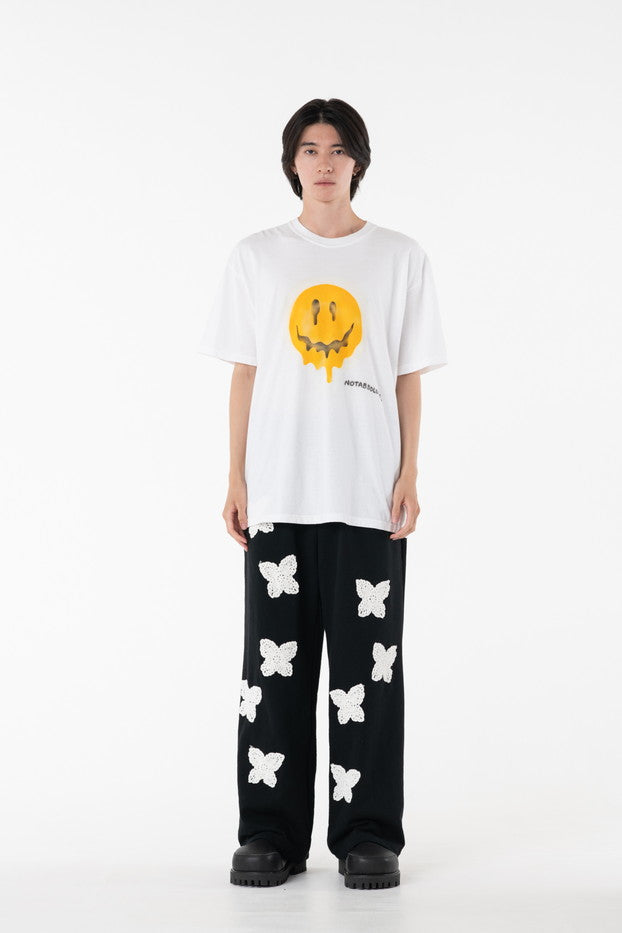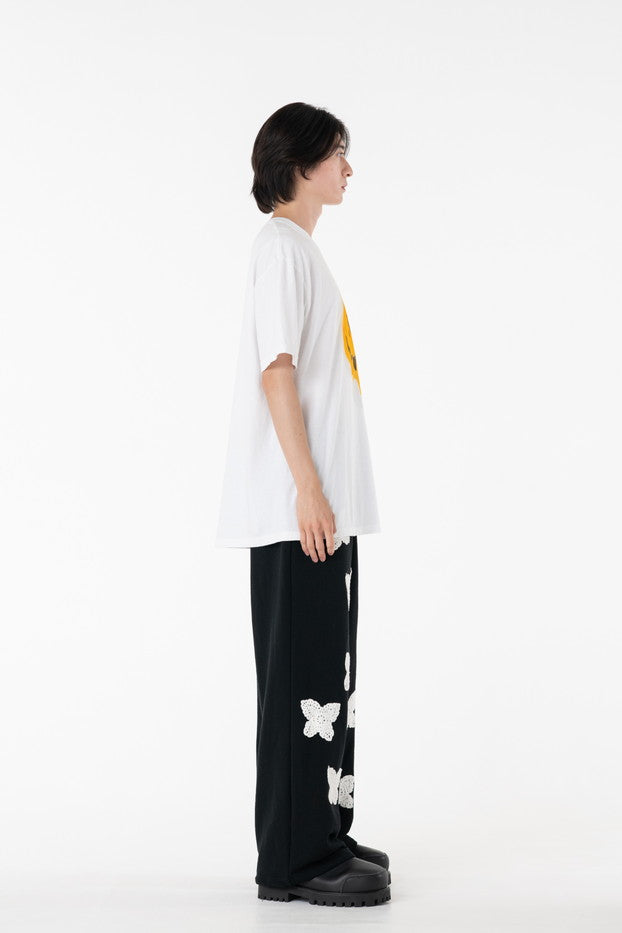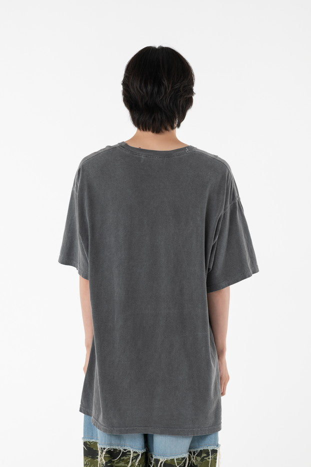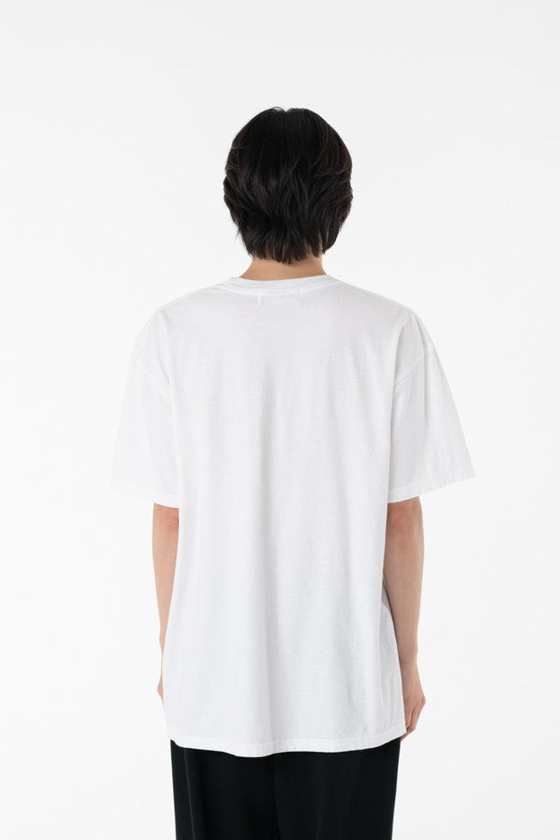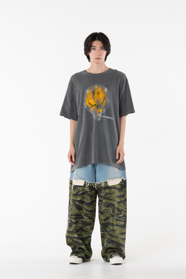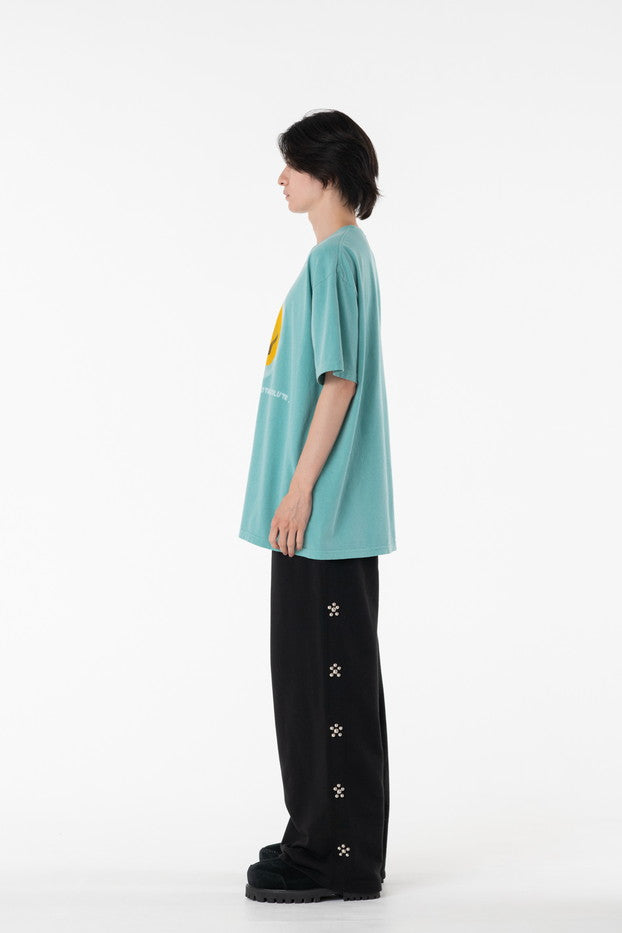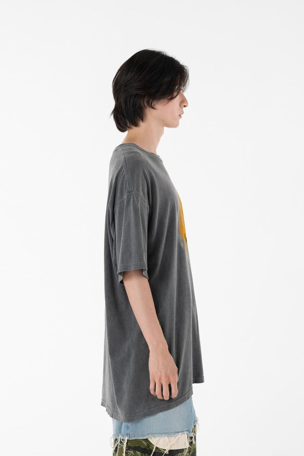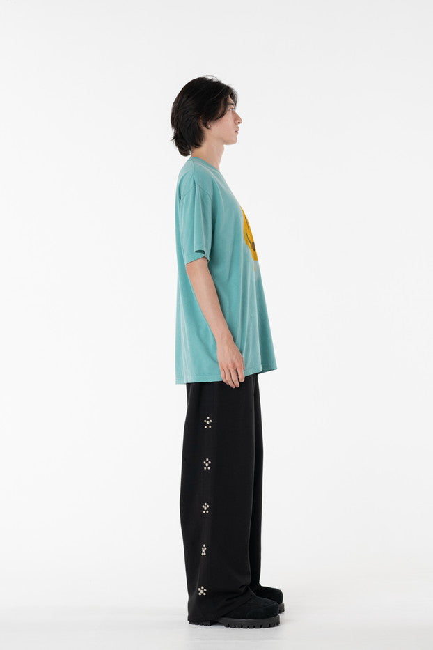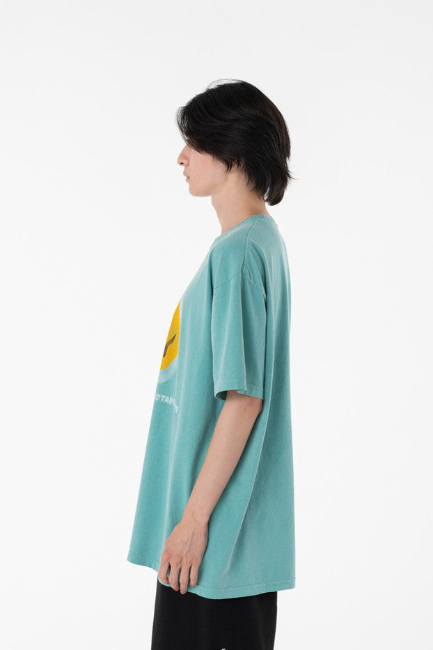 肌触りの良い滑らかなソフト天竺を使用した半袖Tシャツ。淀よくゆとりのあるシルエットとピグメント加工、エアブラシでハンドペイントにて描かれたスマイルマークがポイントとなったアイテム。