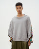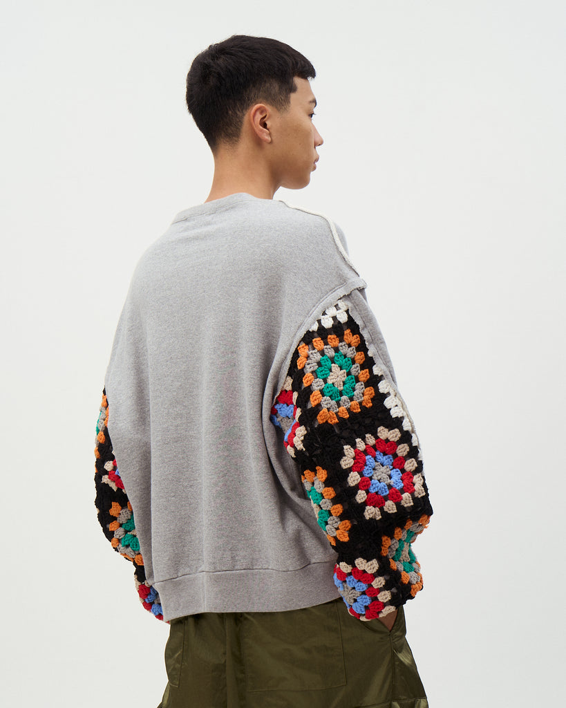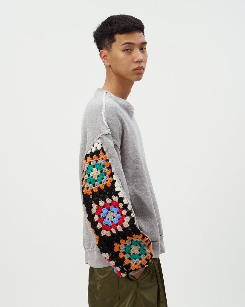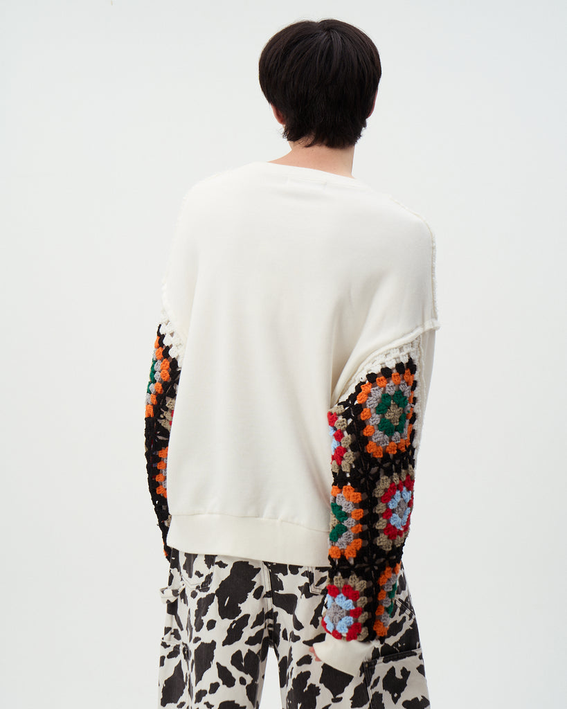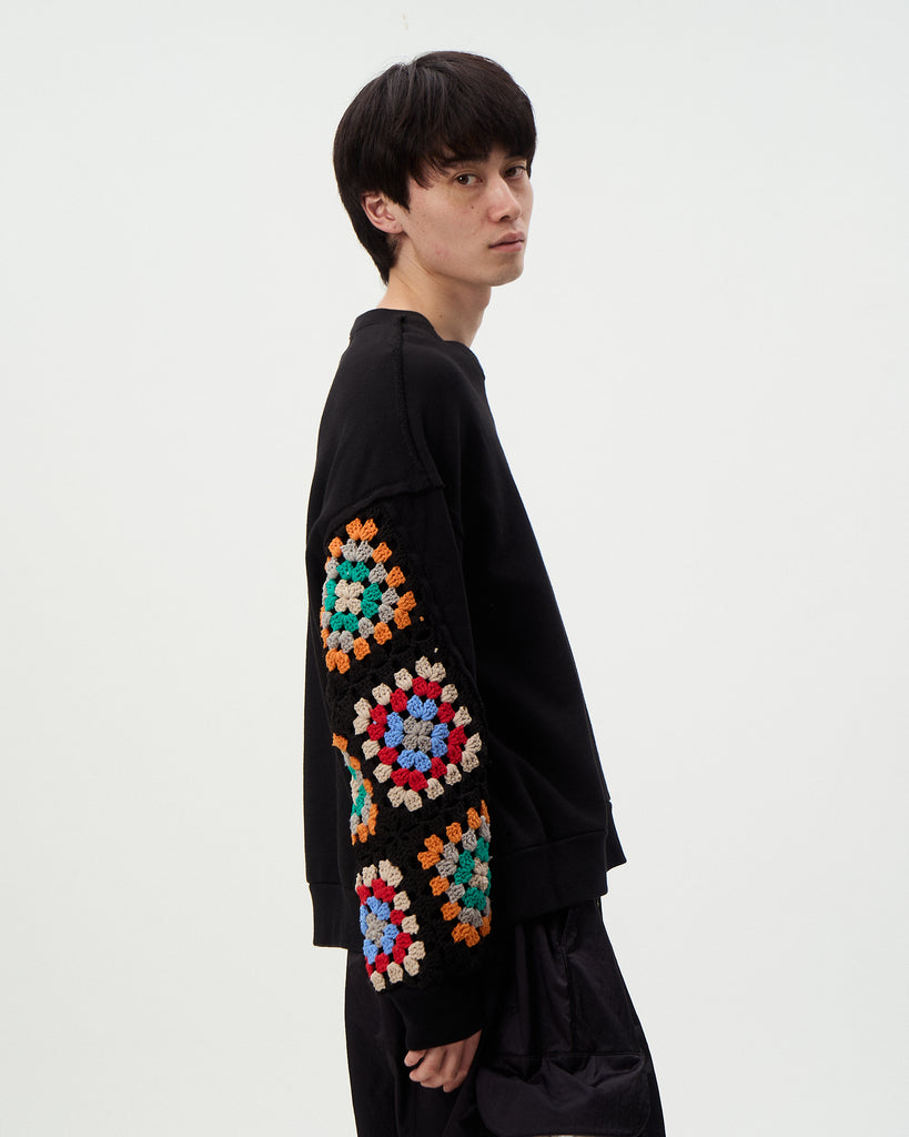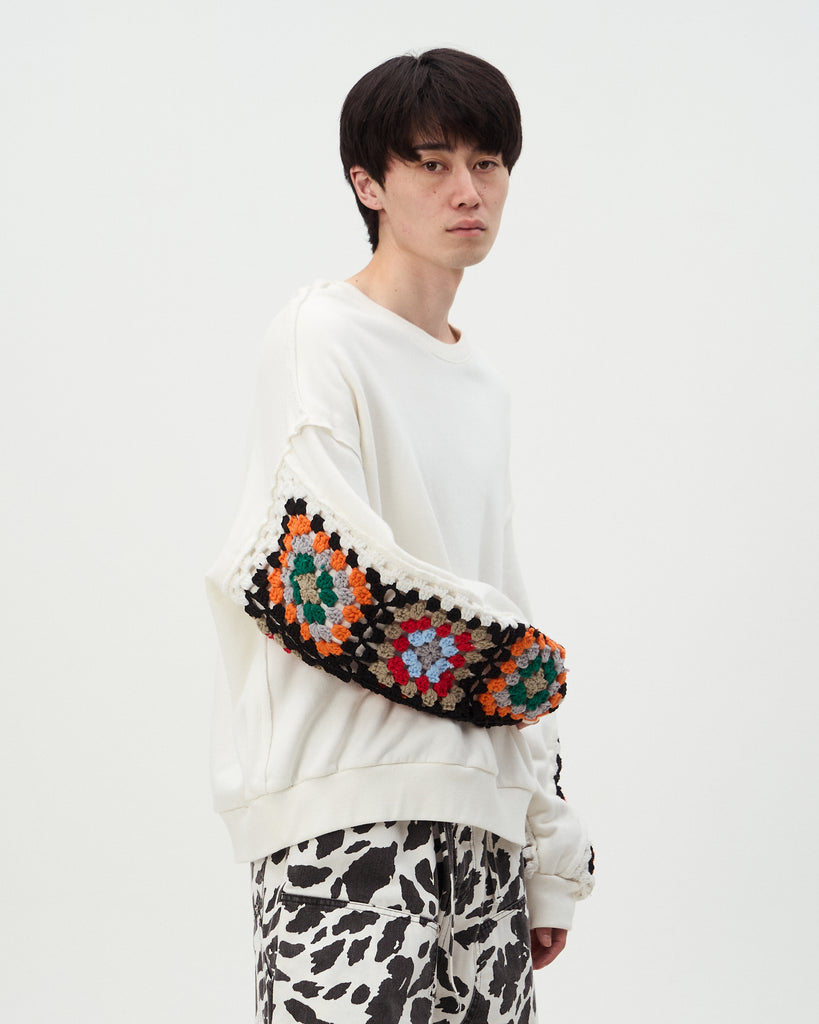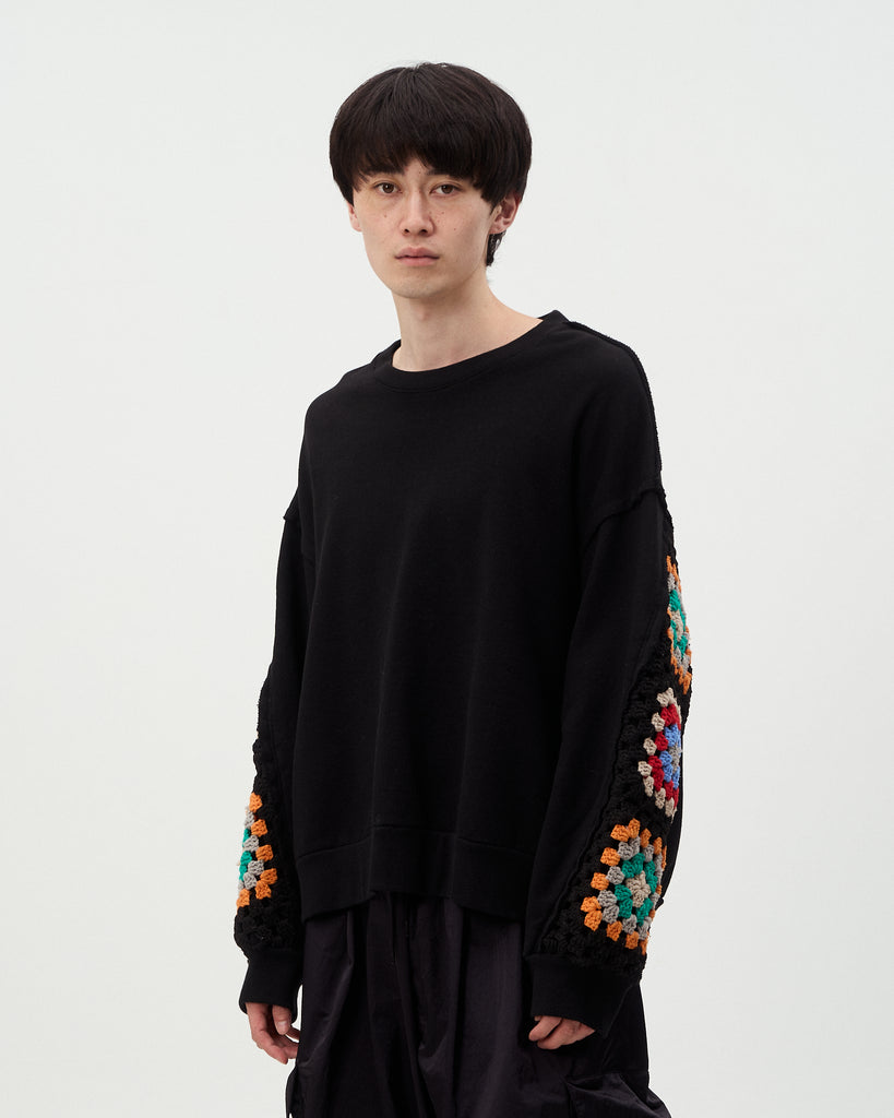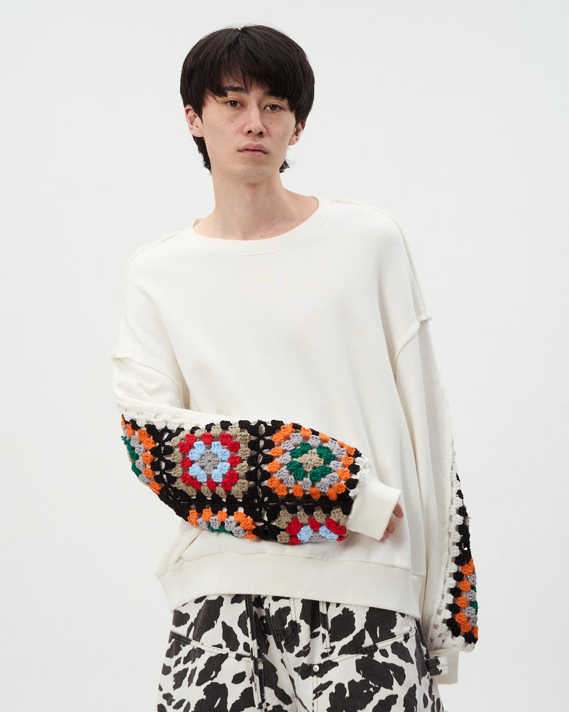 適度な保温性と⾼い吸⽔性があるしっかりとした 20/10裏⽑を使⽤したスウェット。袖下に配された クロシェット編みがポイントとなったアイテム。