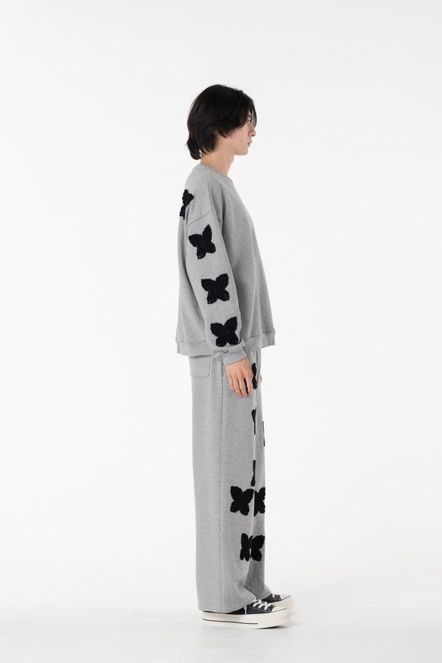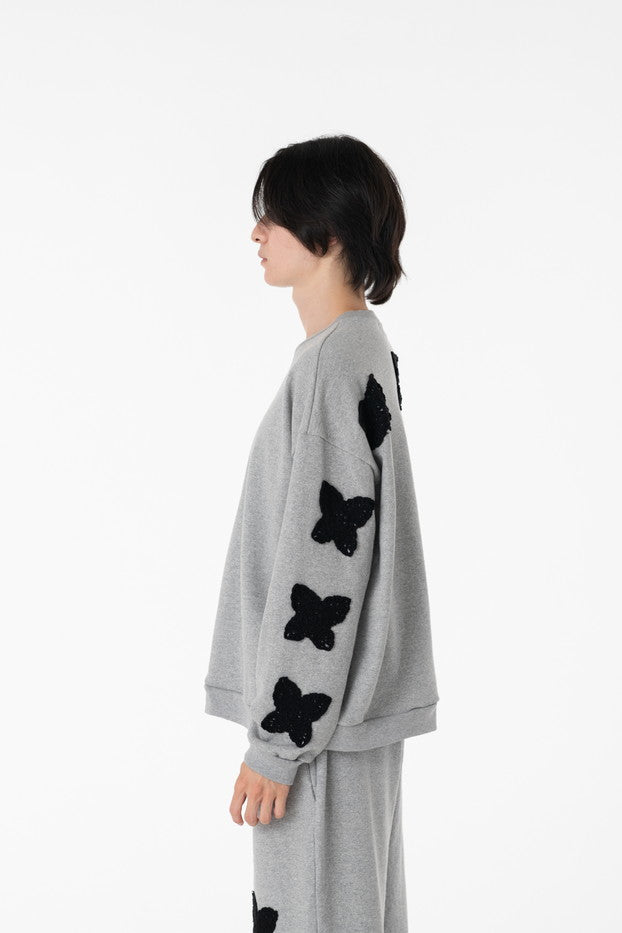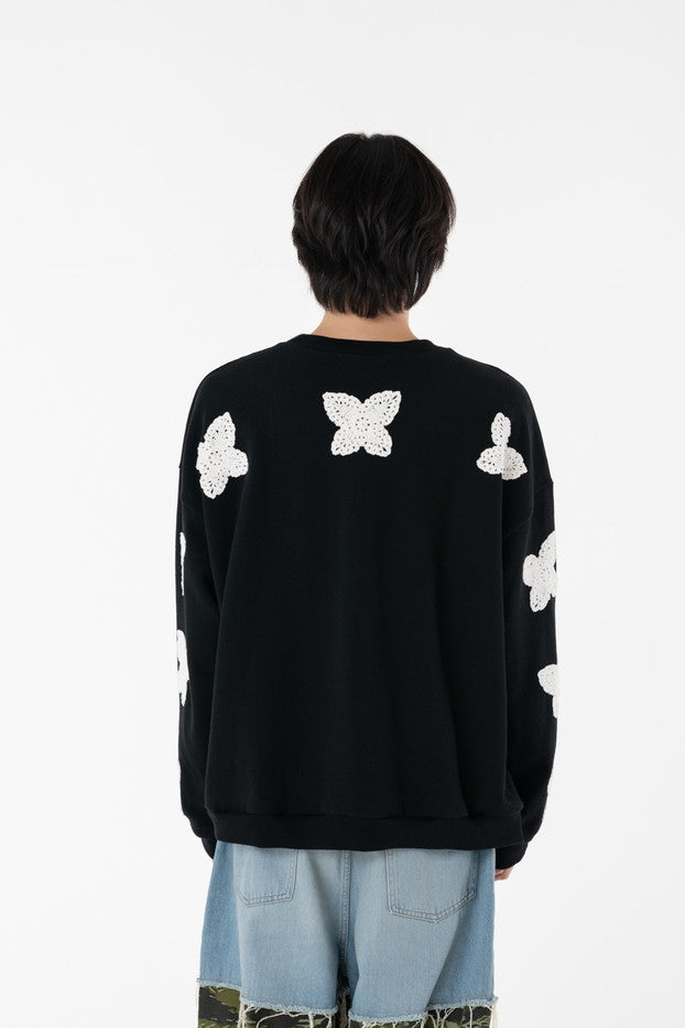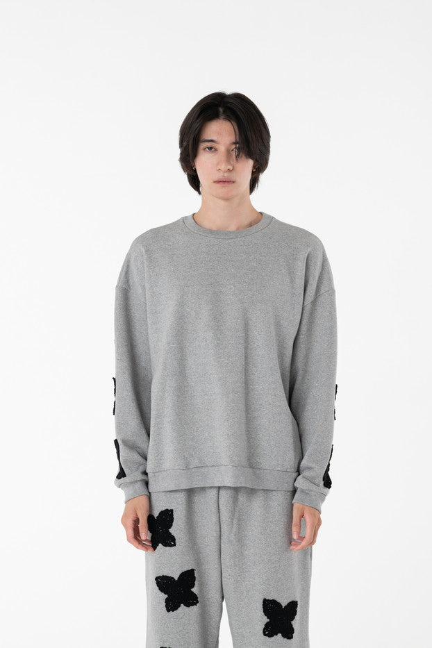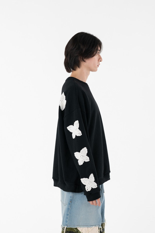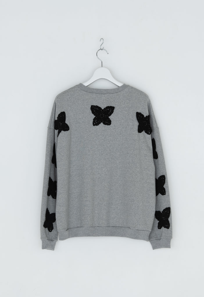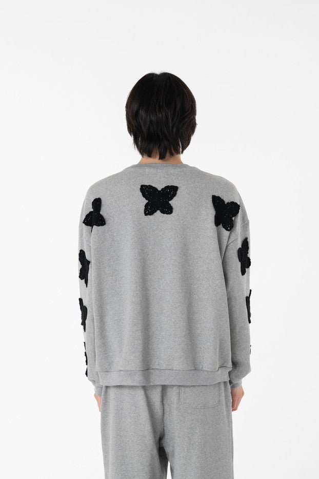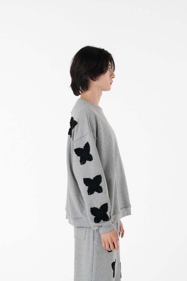 適度な保温性と⾼い吸⽔性がある しっかりとした 20/10裏⽑を使⽤したスウェット。適度なゆとりのあるシルエットと手編みで作成された蝶々モチーフのクロシェットがポイントとなったアイテム。