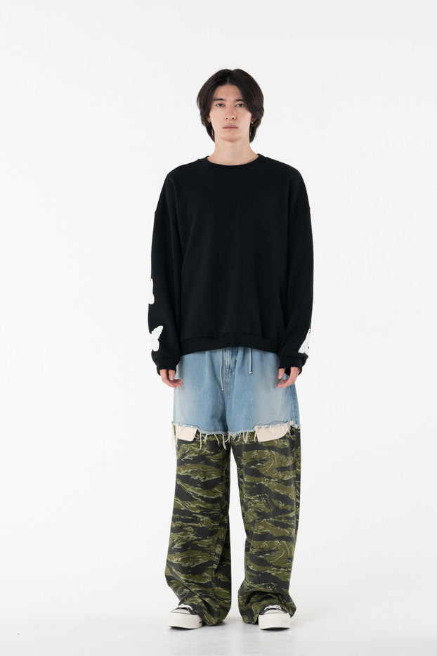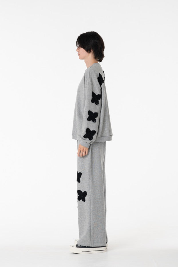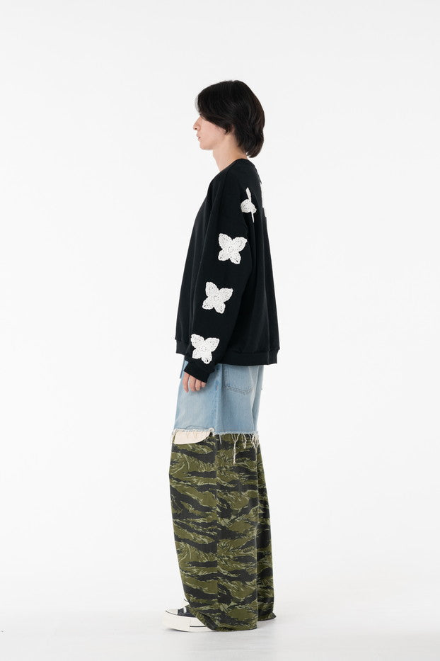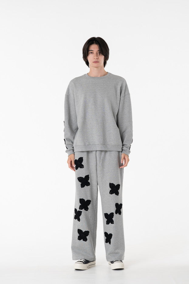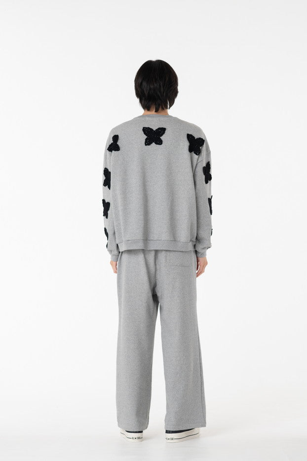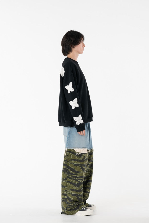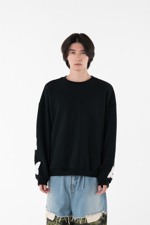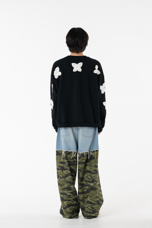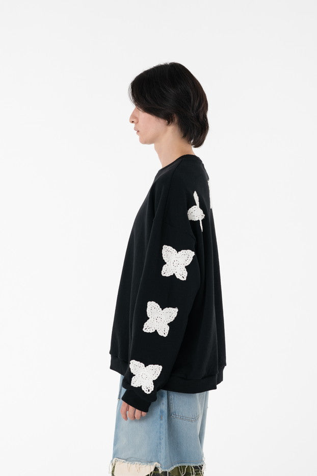 適度な保温性と⾼い吸⽔性がある しっかりとした 20/10裏⽑を使⽤したスウェット。適度なゆとりのあるシルエットと手編みで作成された蝶々モチーフのクロシェットがポイントとなったアイテム。