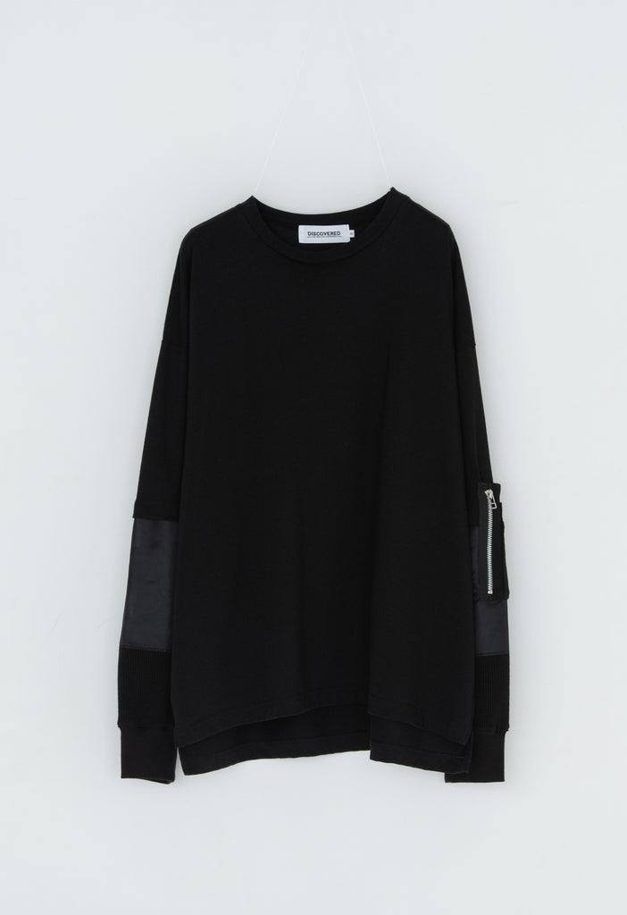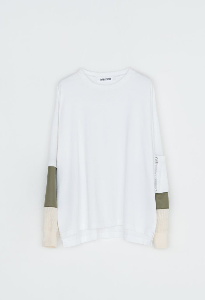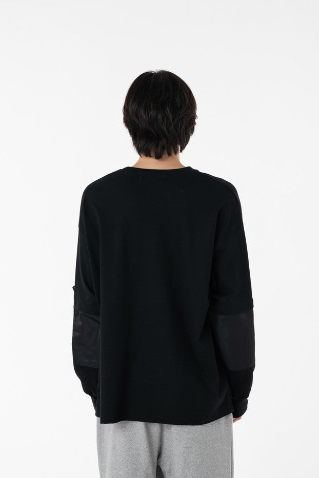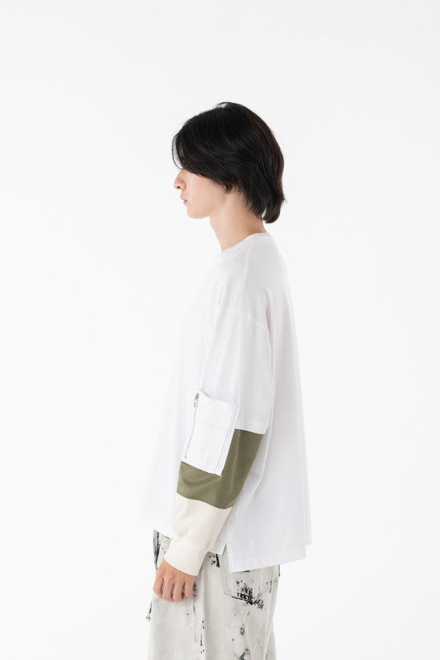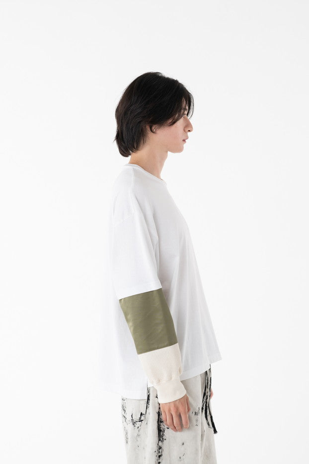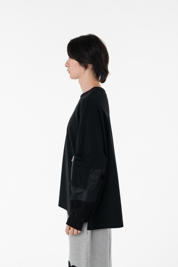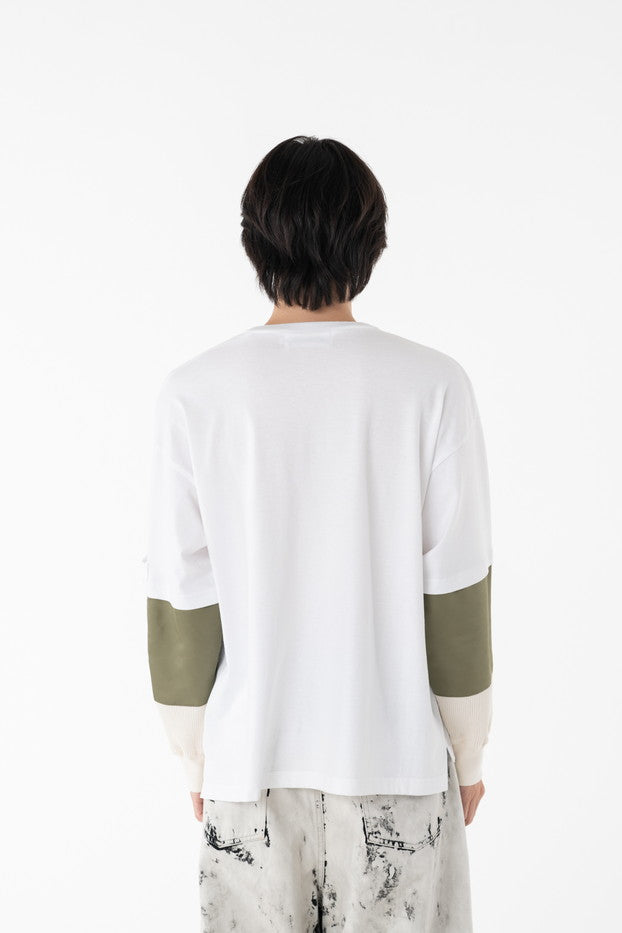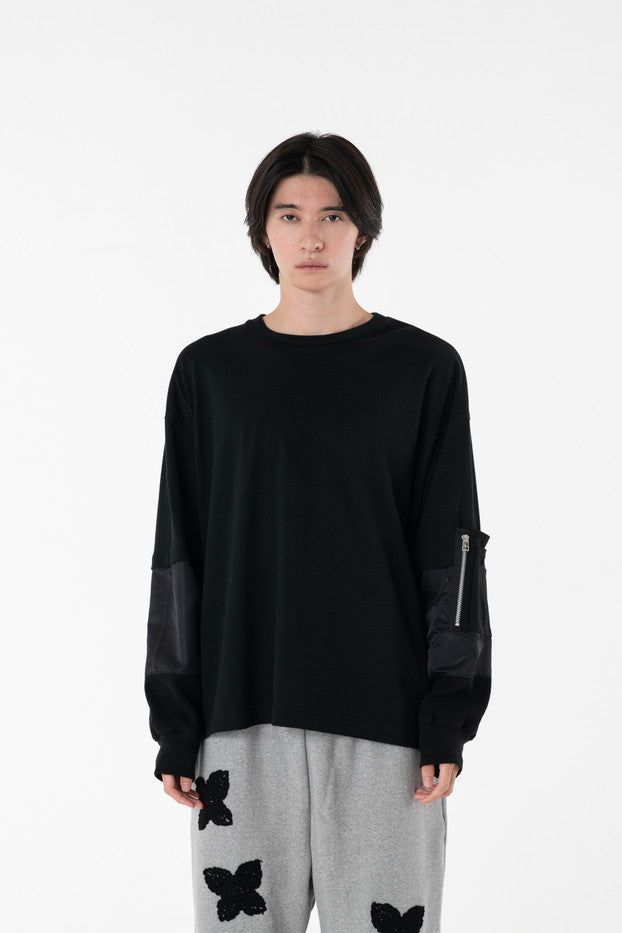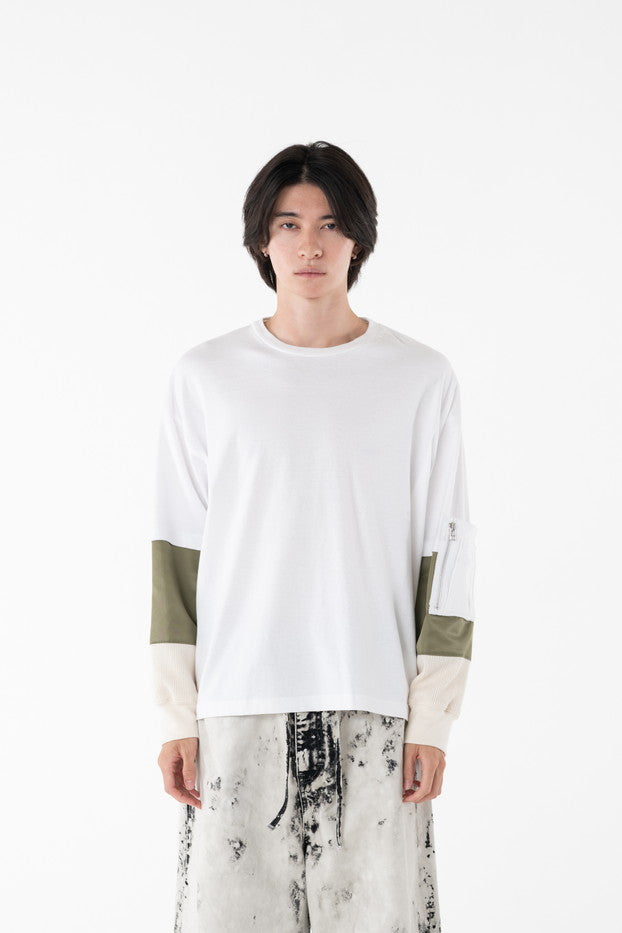 柔らかく通気性の良い着心地抜群の天竺を使用したデザインカットソー。袖に配したミリタリーを想起させるナイロン、サーマルの切り替え、MA-1ポケットがインパクト大なアイテム。