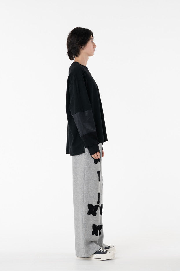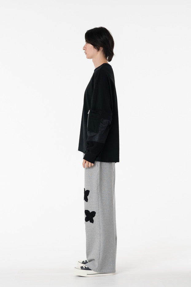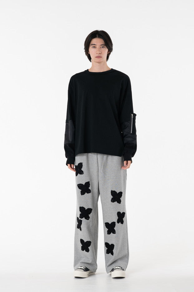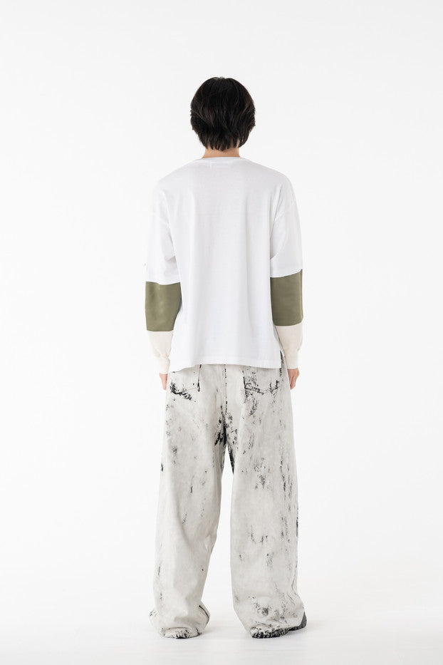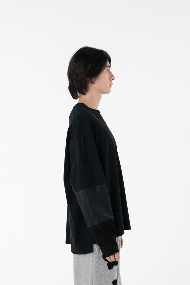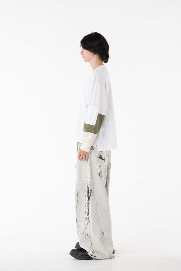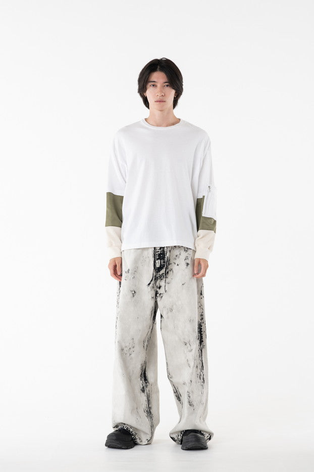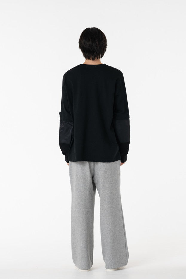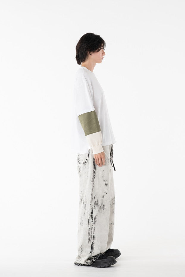 柔らかく通気性の良い着心地抜群の天竺を使用したデザインカットソー。袖に配したミリタリーを想起させるナイロン、サーマルの切り替え、MA-1ポケットがインパクト大なアイテム。